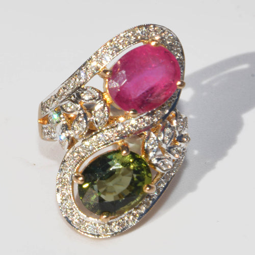 Bague cocktail toi et moi ,en or jaune et gris sertie de tourmalines