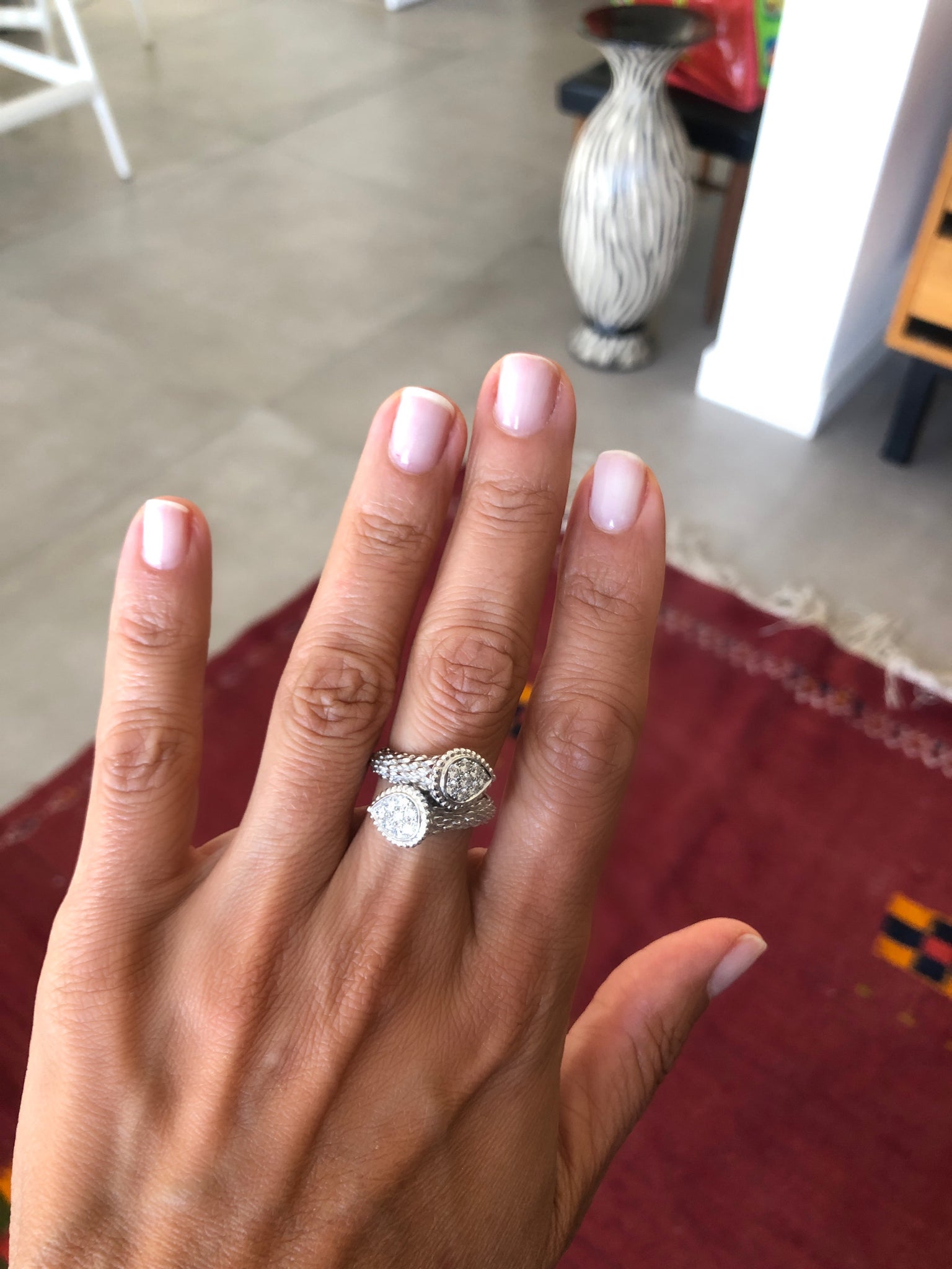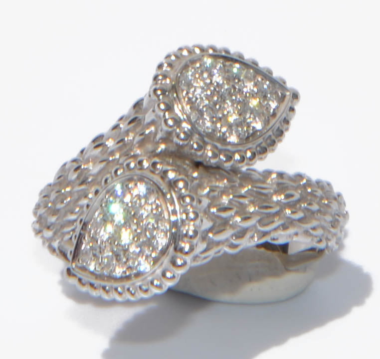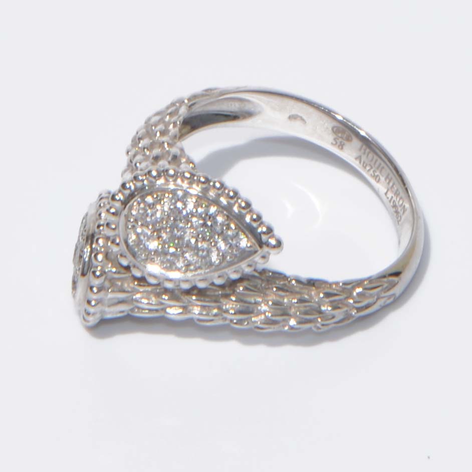 Bague de la maison Boucheron Serpent Bohème en or gris, et en diamants, composée d'un anneau formant un toi et moi texturé, ornée de 2 motifs piriformes pavés de 16 diamants de taille brillant, réhaussée d'une bordure perlée.