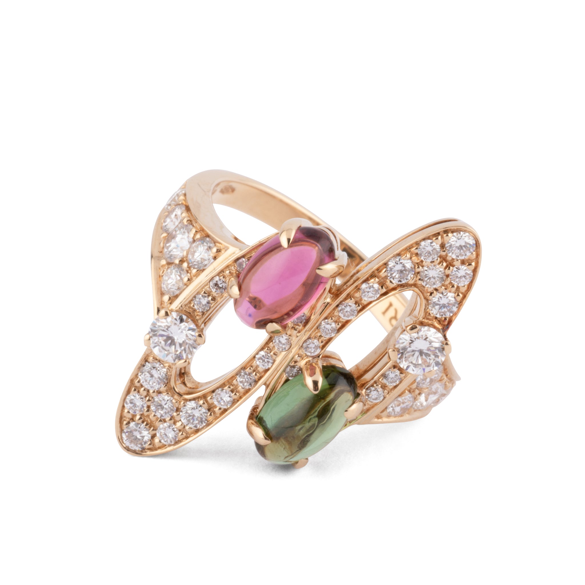 Bague en or jaune de la maison Bvlgari modèle Elisia ajourée retenant En décalé, une tourmaline rose, une tourmaline verte cabochon pavage de diamants brillantés Dont deux principaux 0,10 carat chacun.