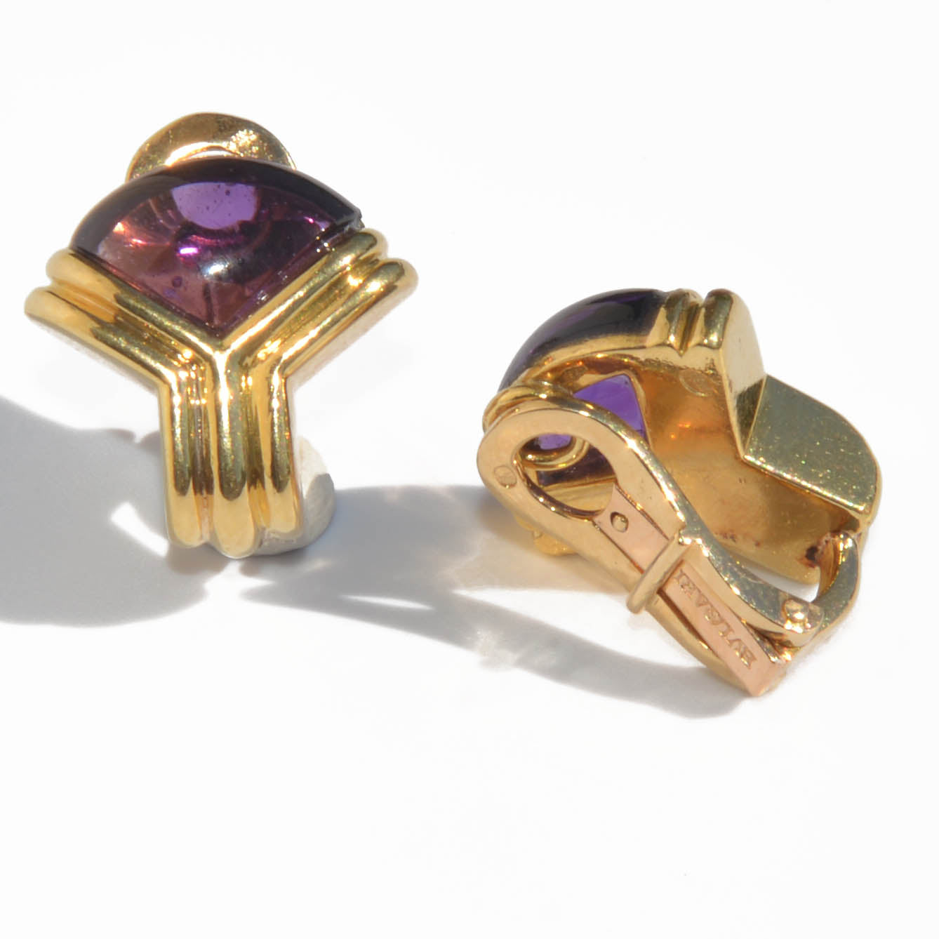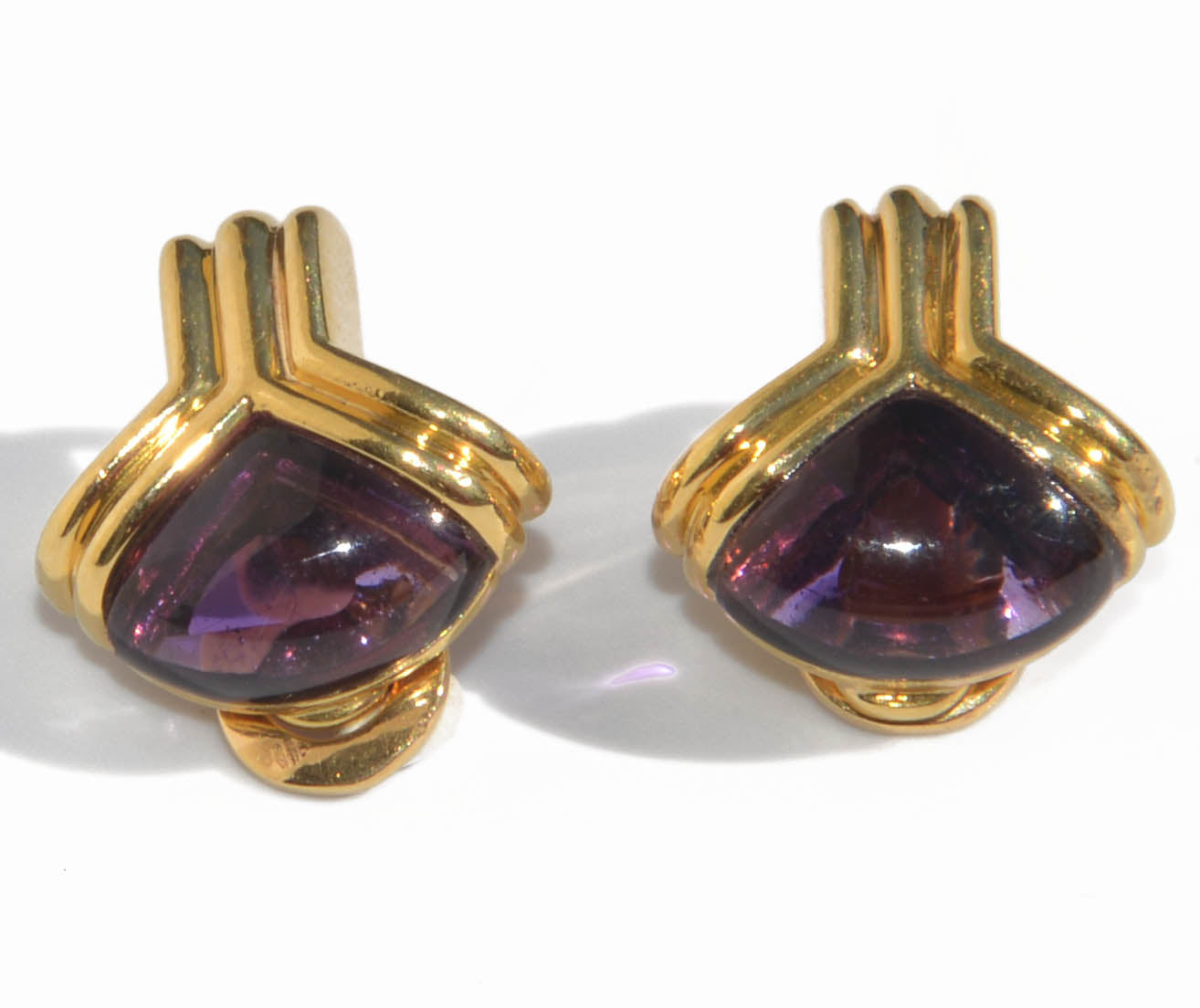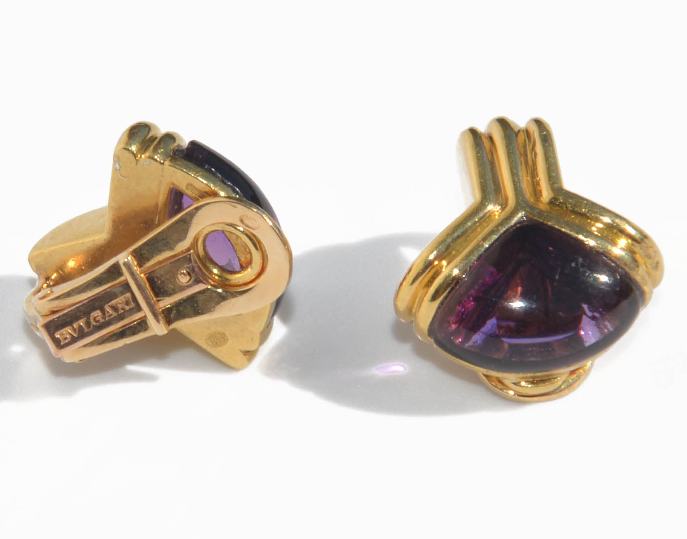 Boucles d'oreilles or jaune de la maison Bvlgari, ornée de 2 améthystes en cabochon formant un triangle sur un motif en or godronné.