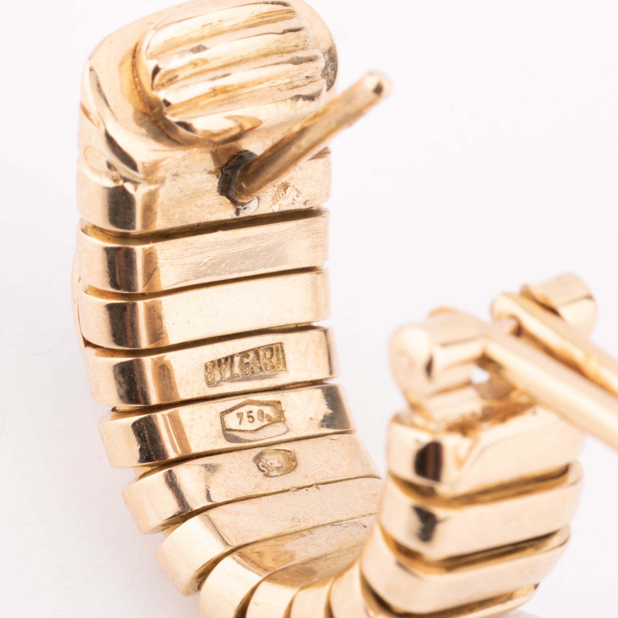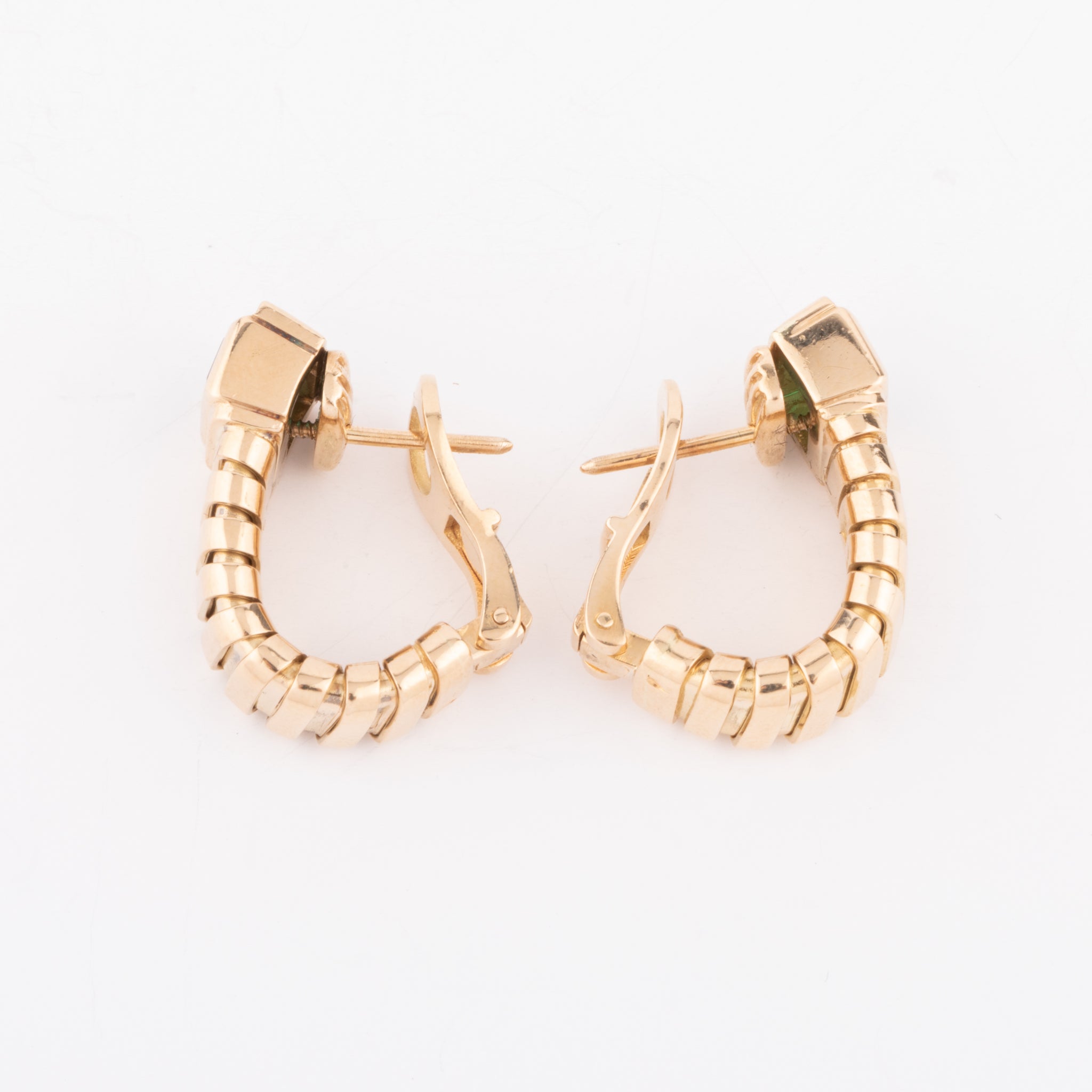 Boucles d'oreilles de la maison Bvlgari Tubogas sur or jaune ornée de 2 émeraudes calibrées sur chaque boucle d'oreille.