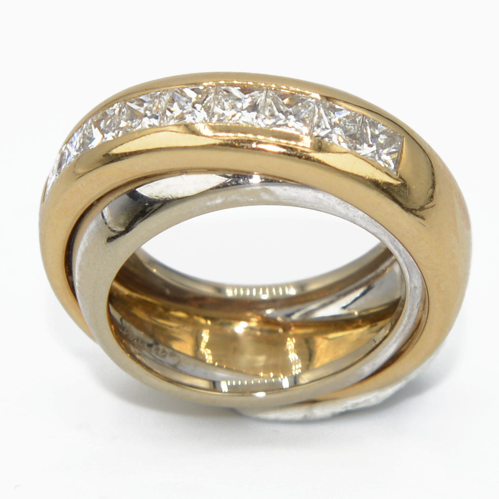 l'anneau forme 2 rubans qui se croisent, celui du dessus est orné d'une ligne de 9 diamants taille princesse totalisant environ 1 carat.