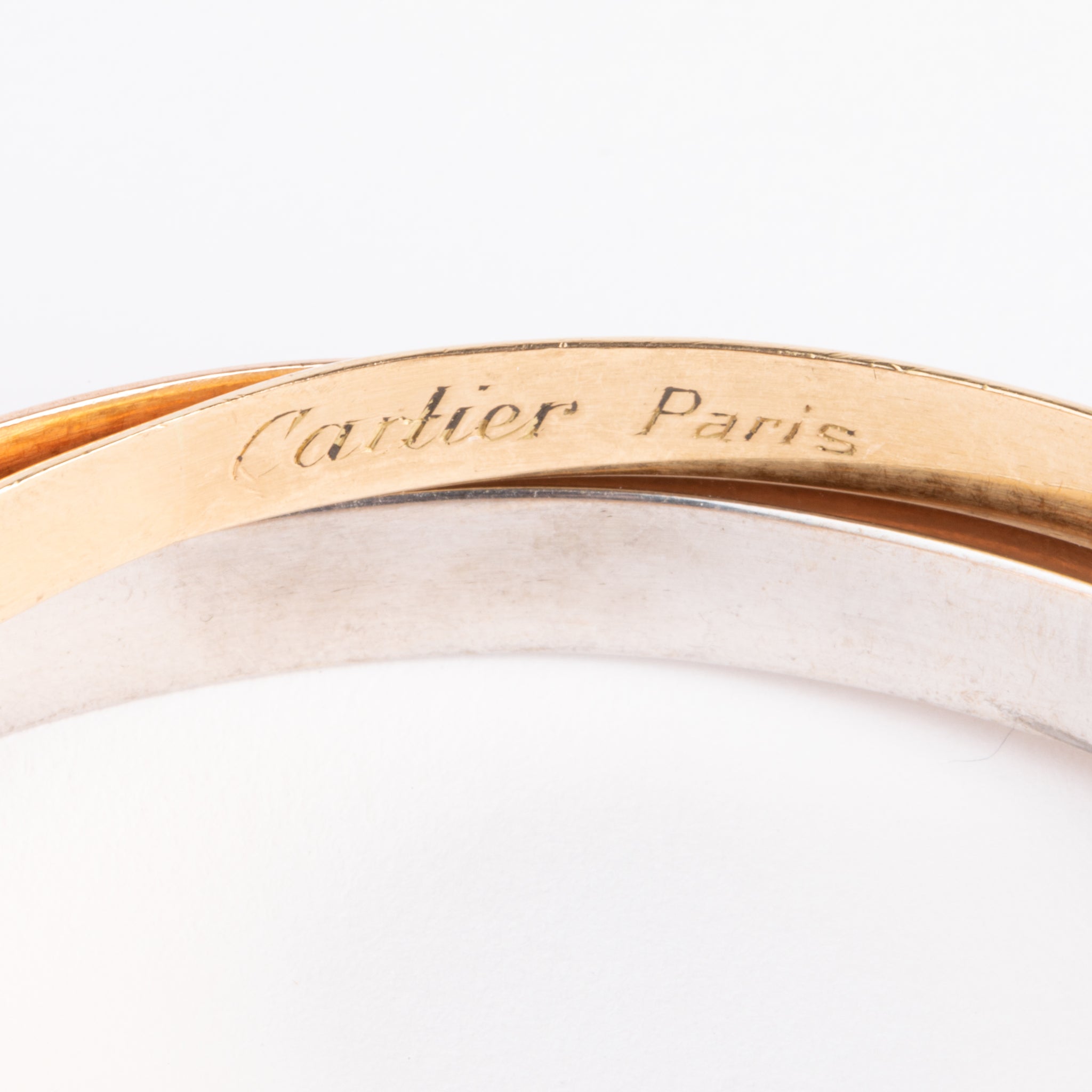 Bracelet Cartier Trinity composé de 3 anneaux importants entrelacés en or rose, blanc et jaune.