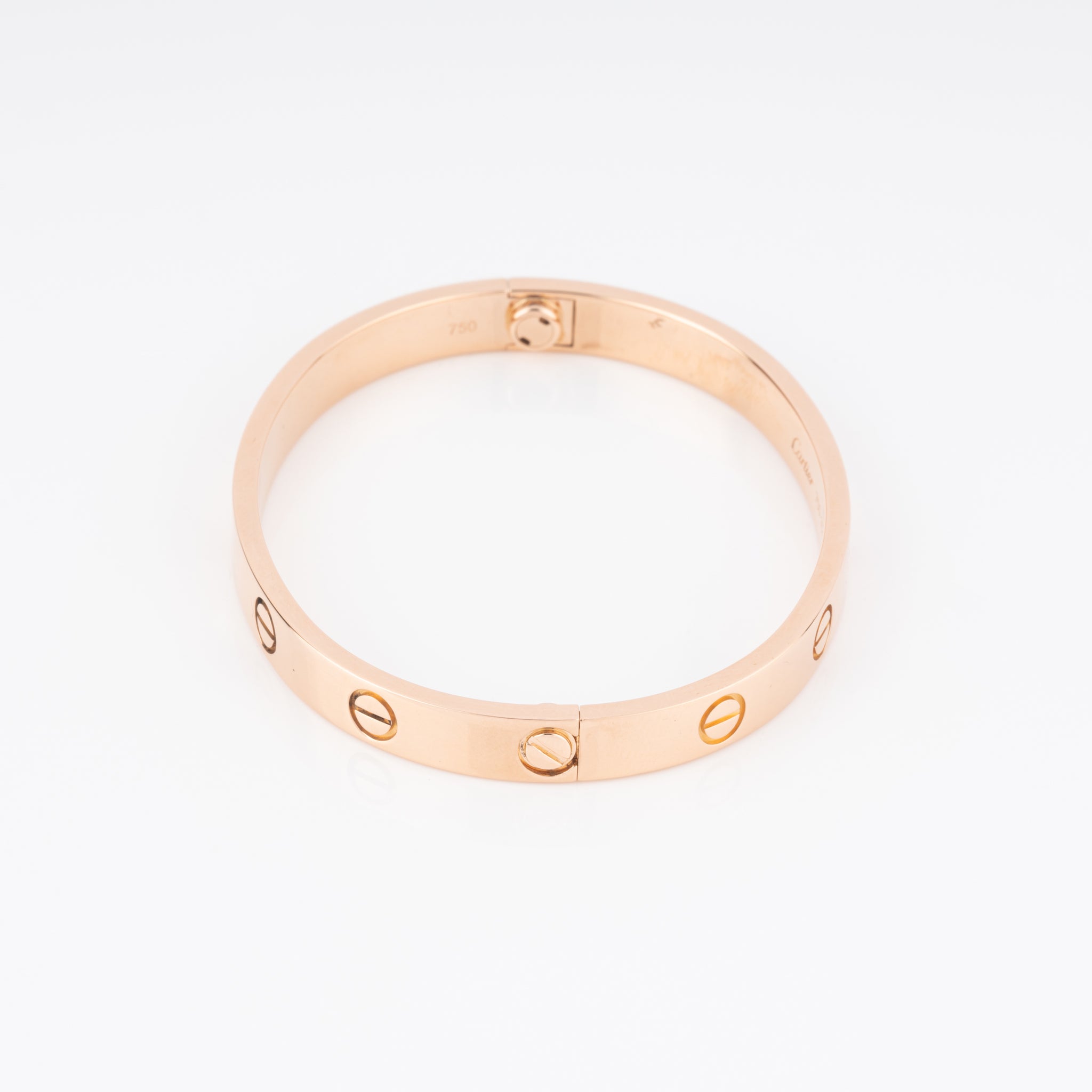 Bracelet Cartier Love grand modèle en or rose , composé d'un élégant bandeau lisse, orné de motifs de vis gravés Taille 16