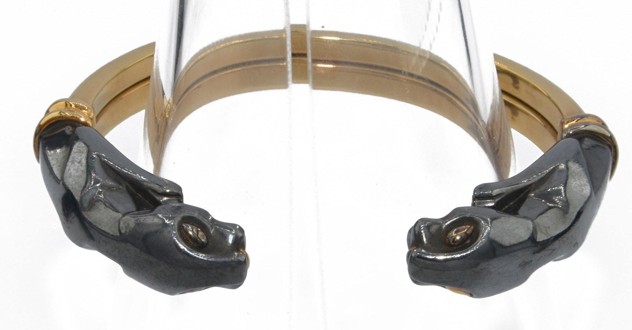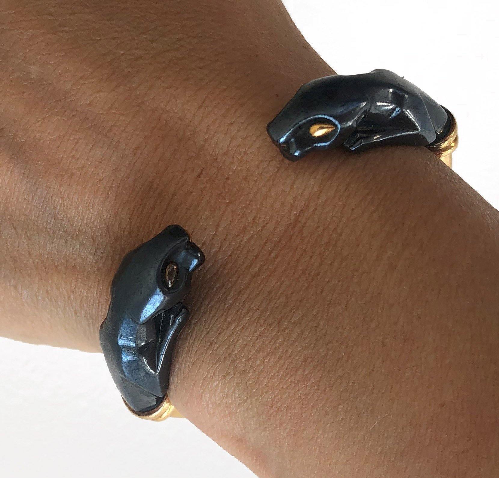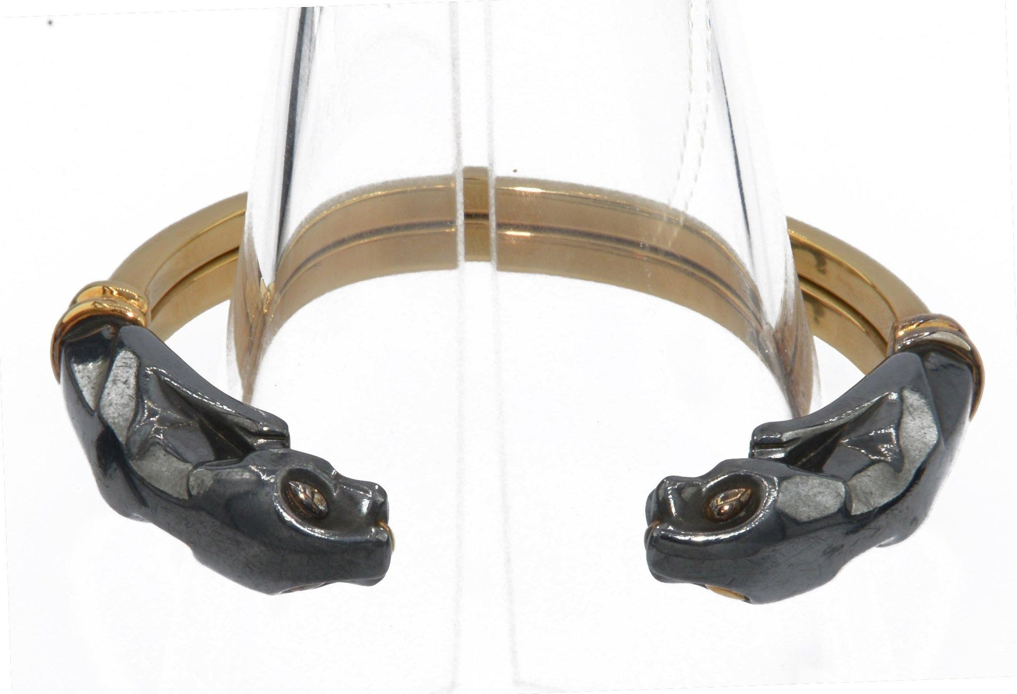 Un bracelet ouvert signé de la maison Cartier modèle Panthère. Les 2 panthères affrontées gravées dans de l'hématite, les yeux et le museau rehaussés sont en or jaune. Signé et numéroté 905530.