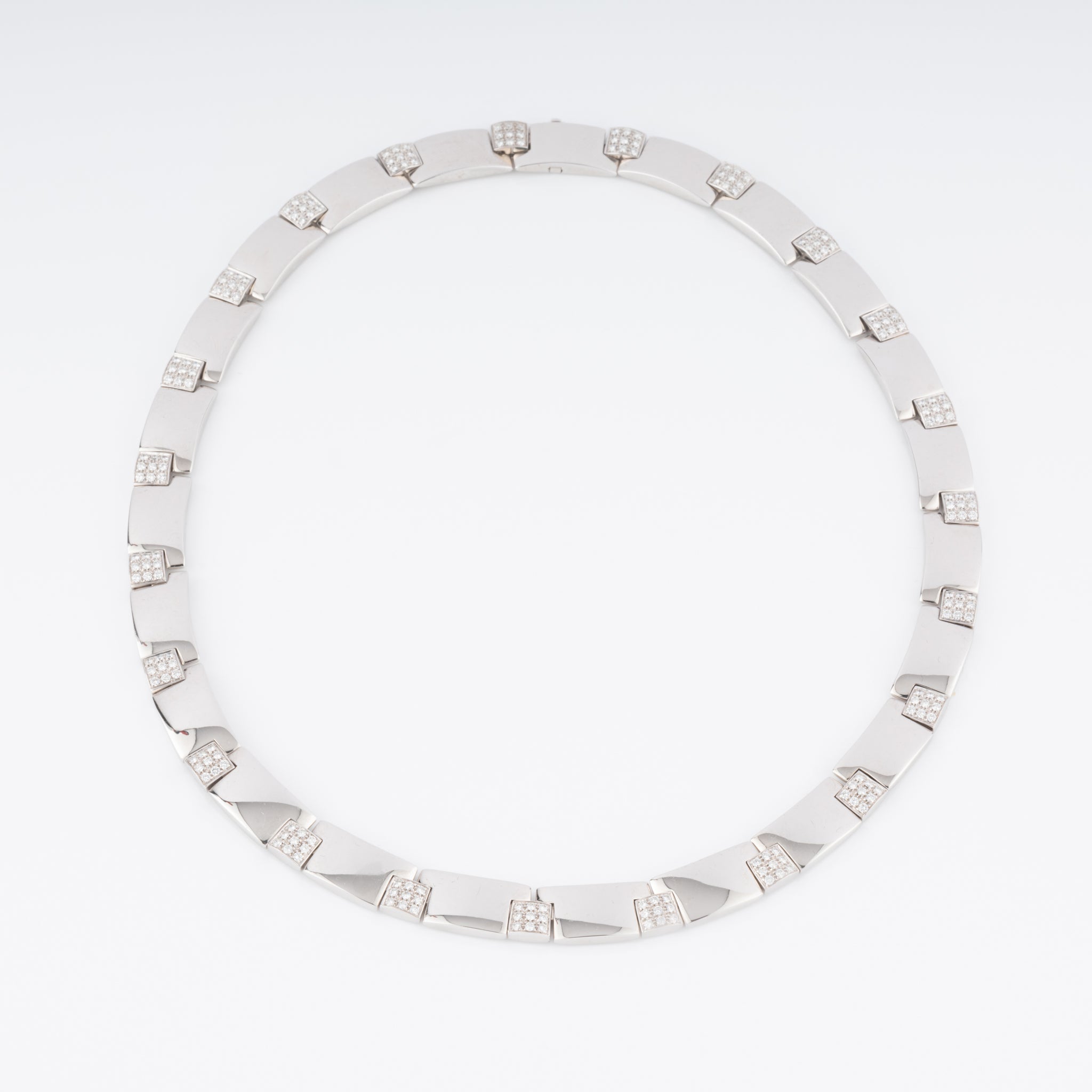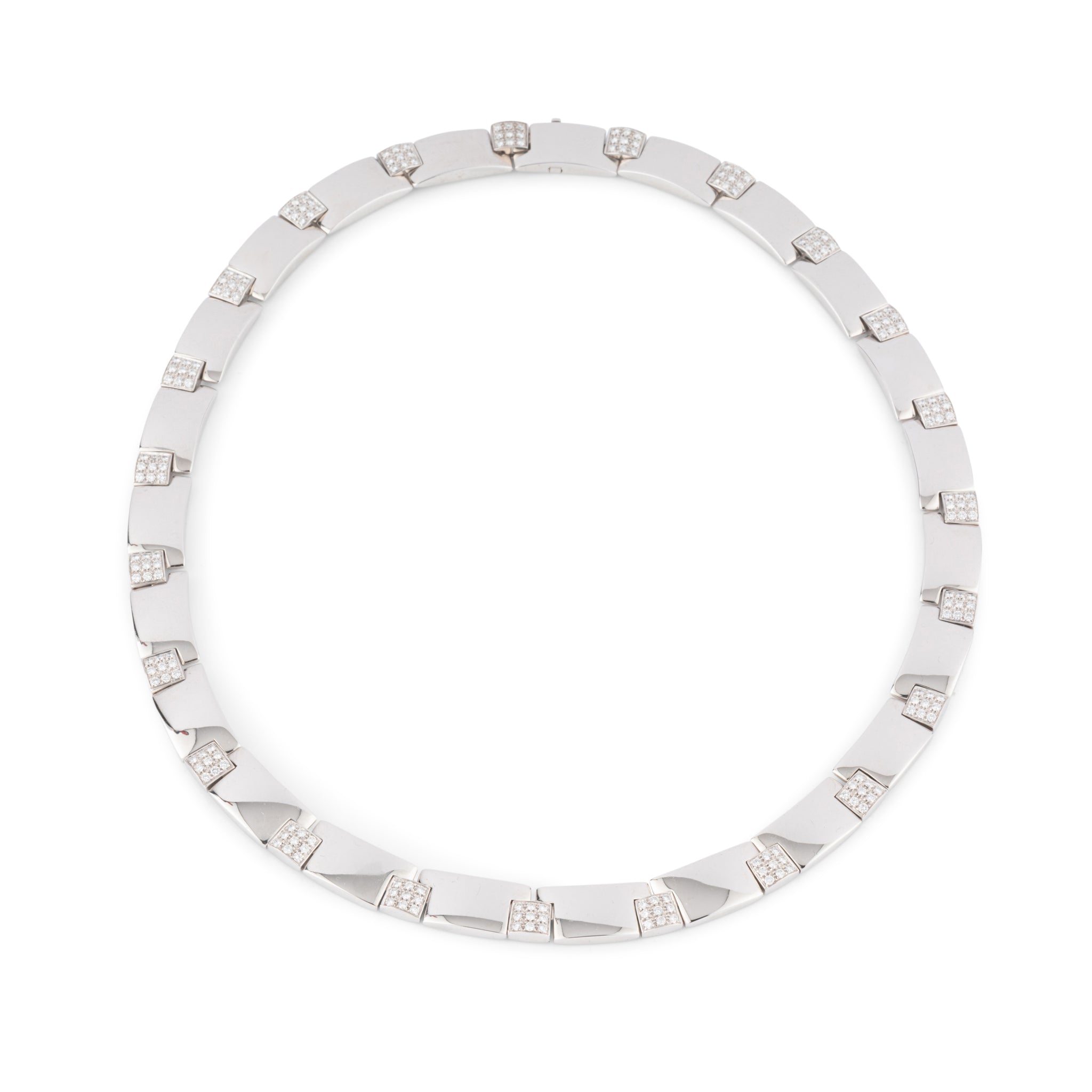 Collier or gris et diamants signé de la Maison Chaumet, orné de plaques géométriques articulées, intercalées de diamants.