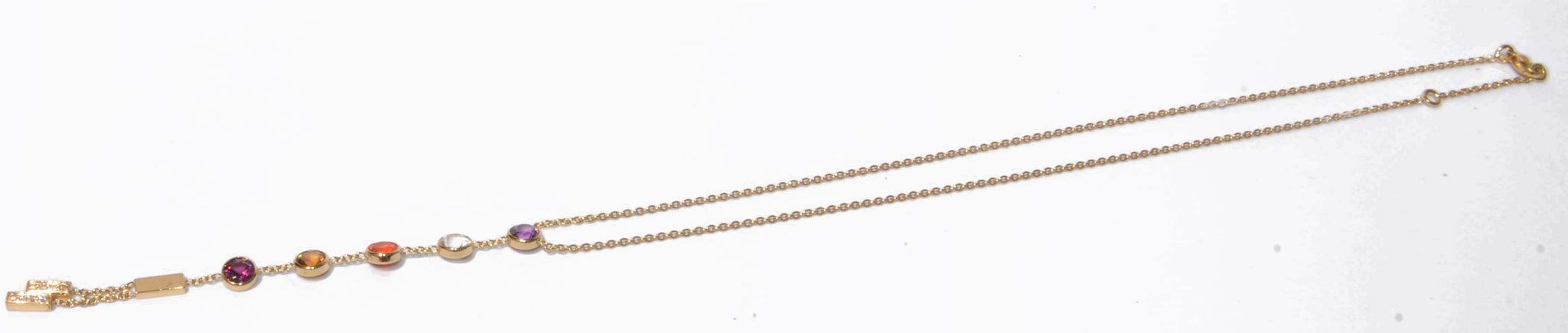 Collier de la maison Chaumet collection Amour en or jaune et pierres de couleurs, composé de 2 améthystes, topaze, opale et citrine réhaussé de 2 petits motifs rectangulaires mobiles finement sertis de diamants de taille brillant, retenu par une chaine à maillons ronds en or jaune.