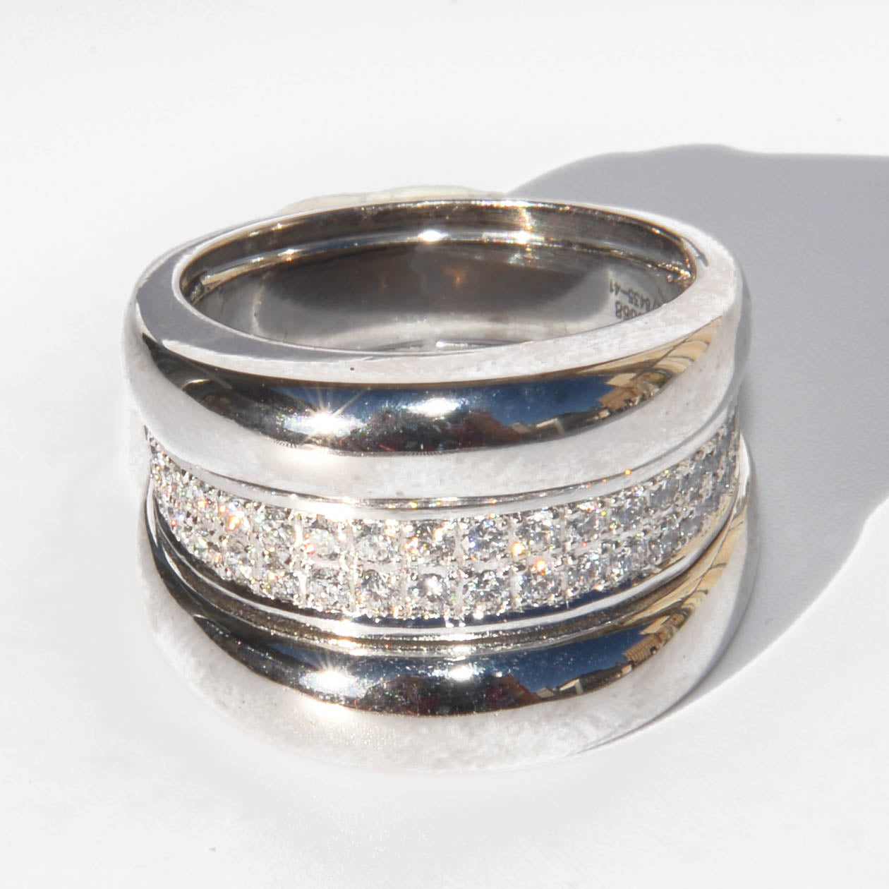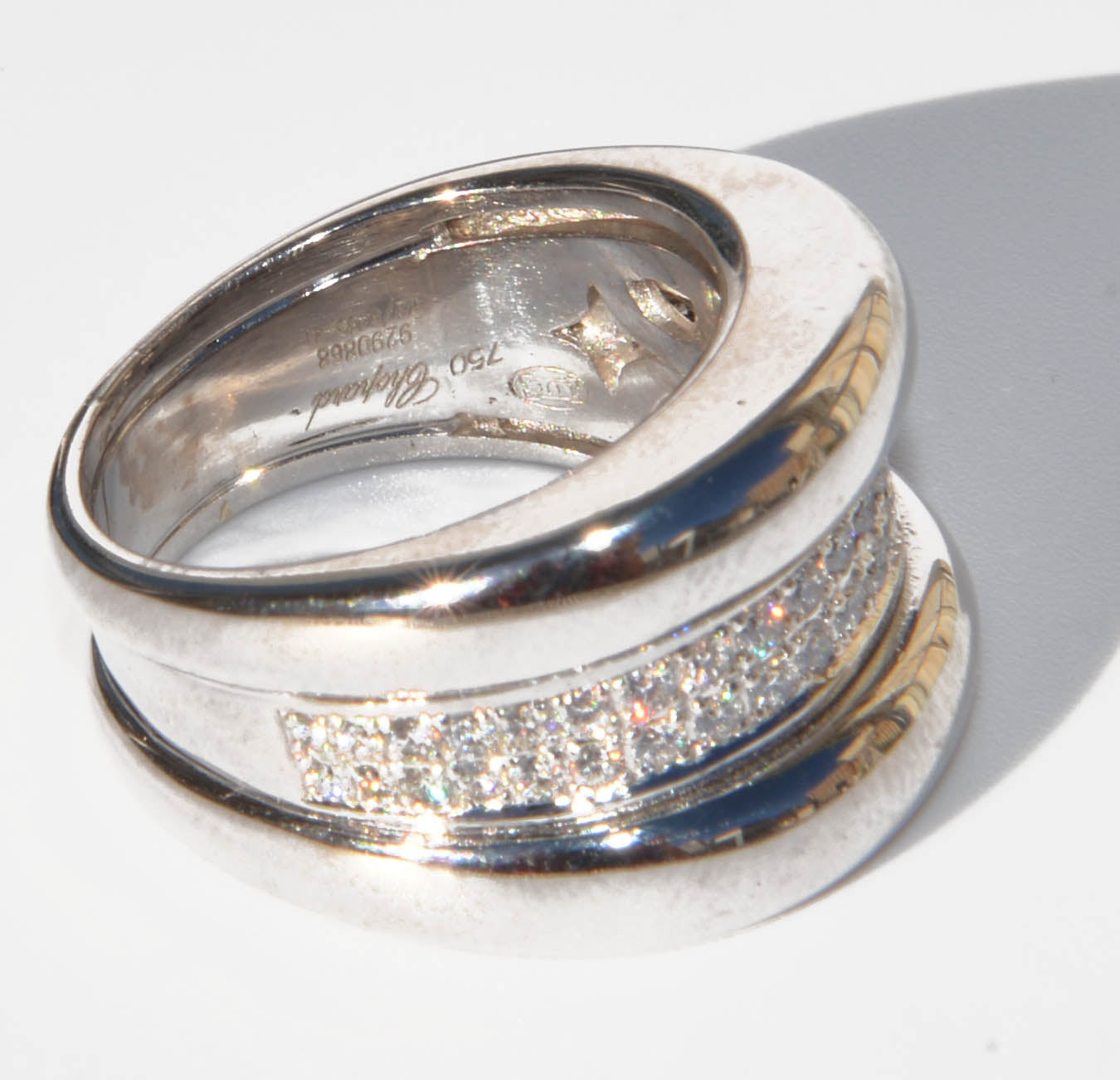 Une bague bandeau signée Chopard, modèle Strada, en or gris sertie d’une double ligne de 42 diamants taille brillant entre 2 godrons.
