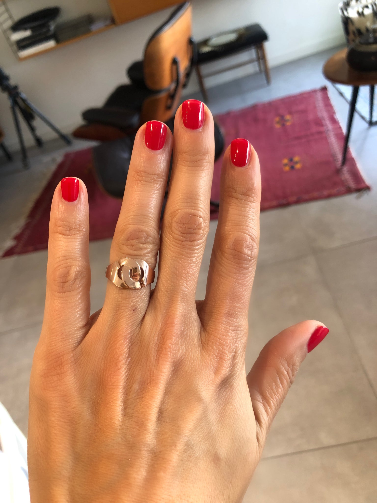 Bague Dinh Van Menottes R12 en or rose, composée en son centre d'une paire de menottes ajourée.