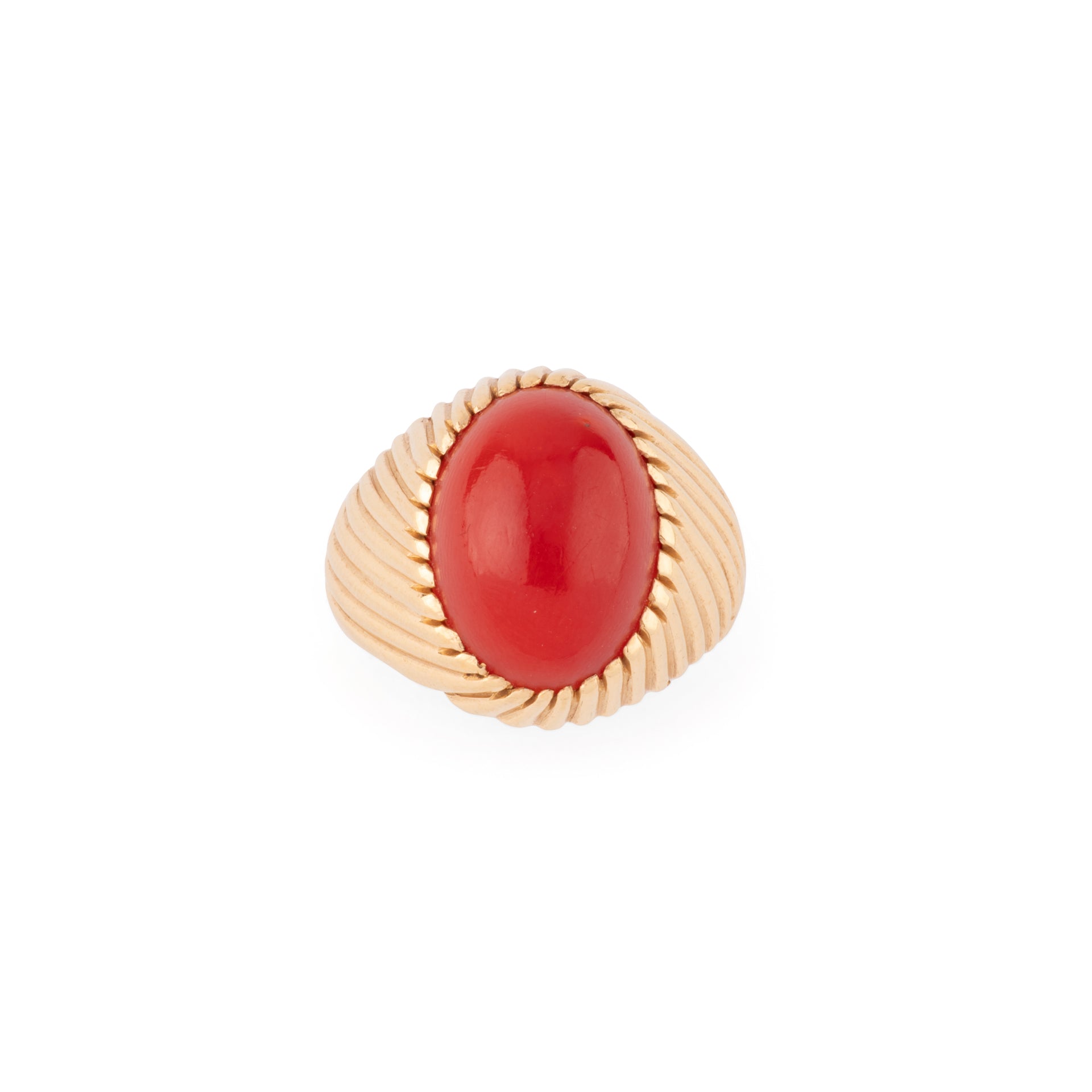 Bague chevalière ornée d'un cabochon de corail sur un large anneau or jaune godronné.