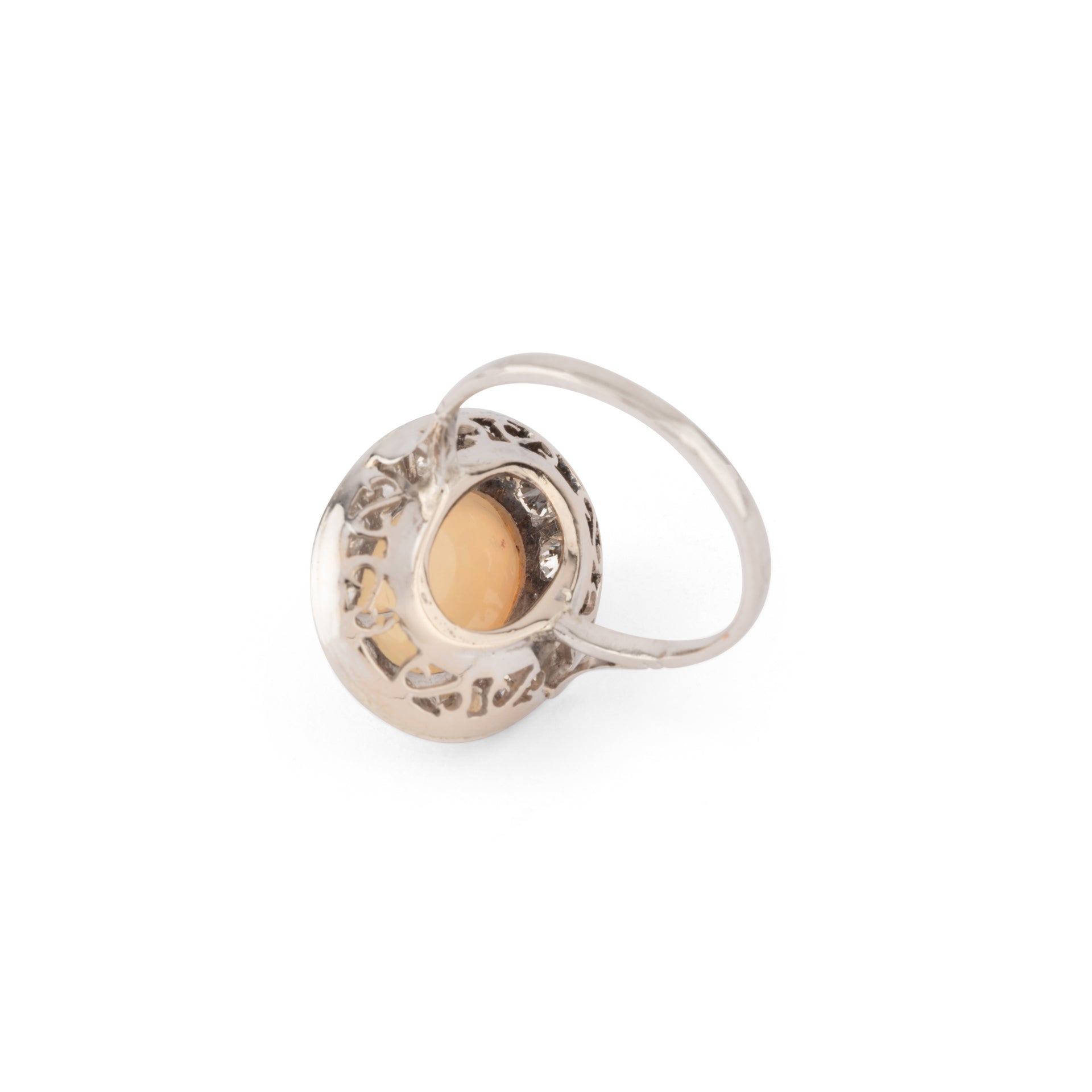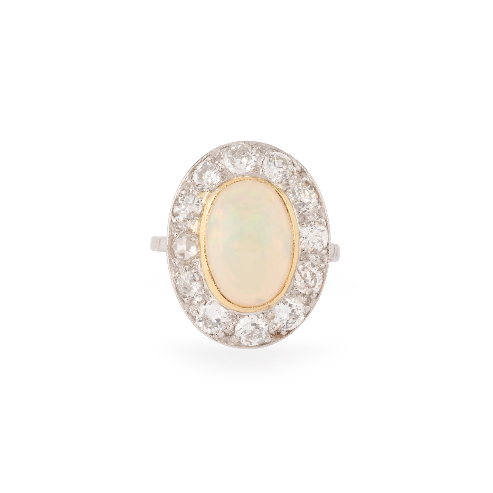 Bague en opale ovale sertie sur platine. Elle est entourée d'un halo de diamants de taille ancienne. Le sertissage en platine souligne la finesse du bijou.