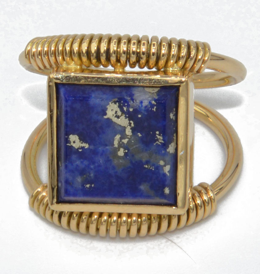 Bague étrusque en or jaune ornée d'un lapis carré. L'or est joliment travaillé de fils d'or entouré sur les anneaux extérieurs.
