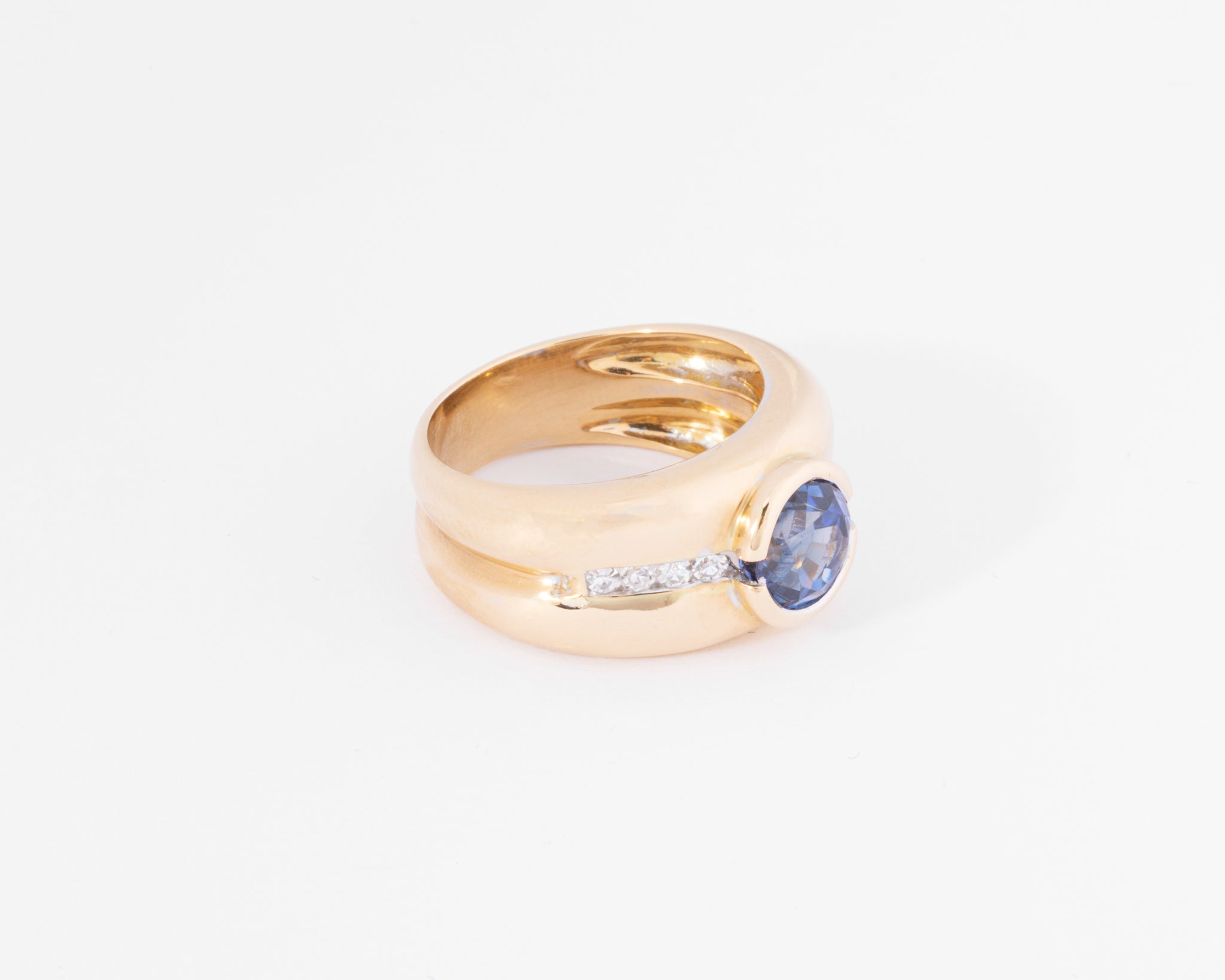 Bague jonc or jaune ornée d'un saphir taille ronde et diamant