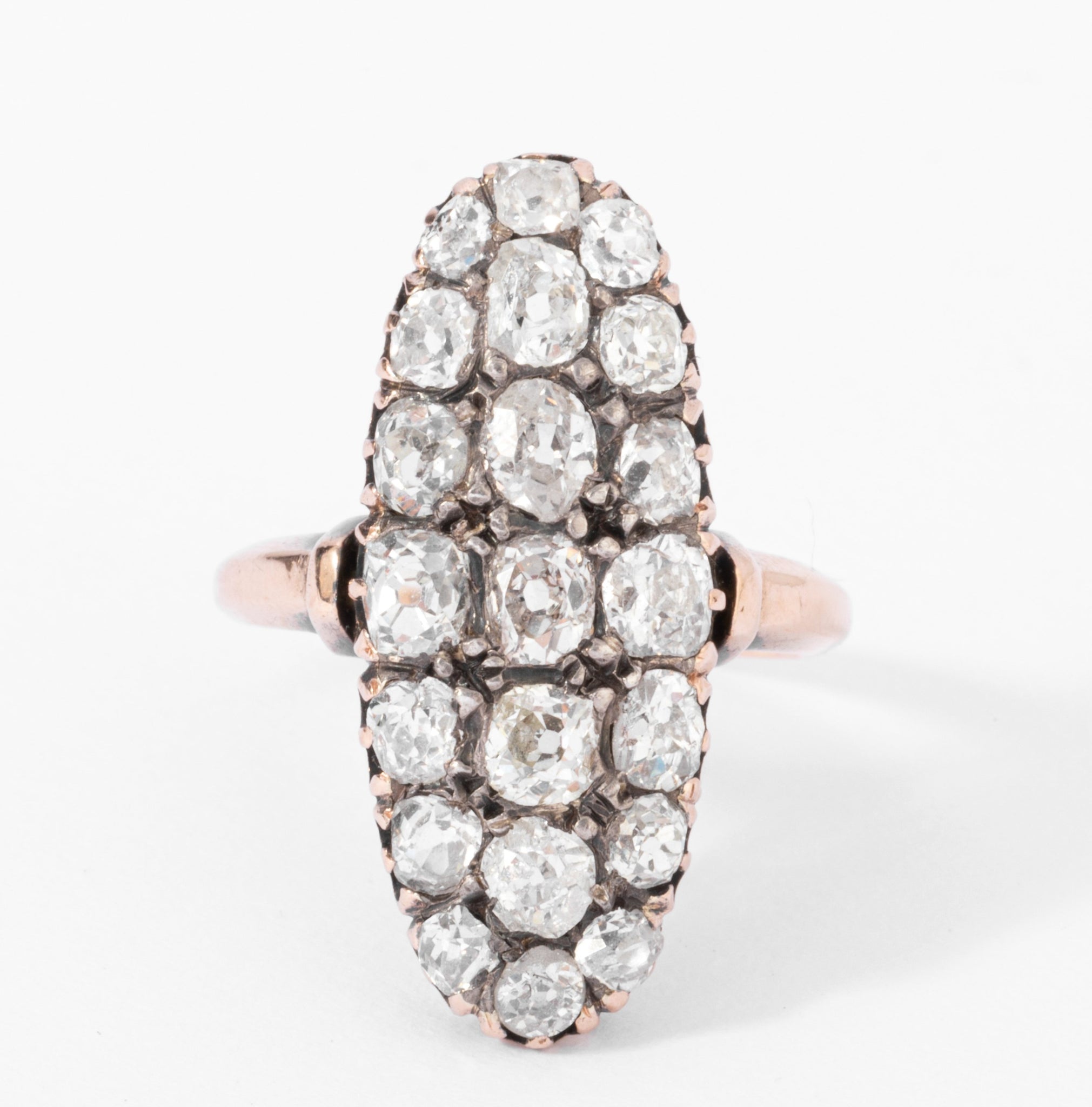 Bague marquise Napoléon III extra plate entièrement pavée de diamant taille ancienne.