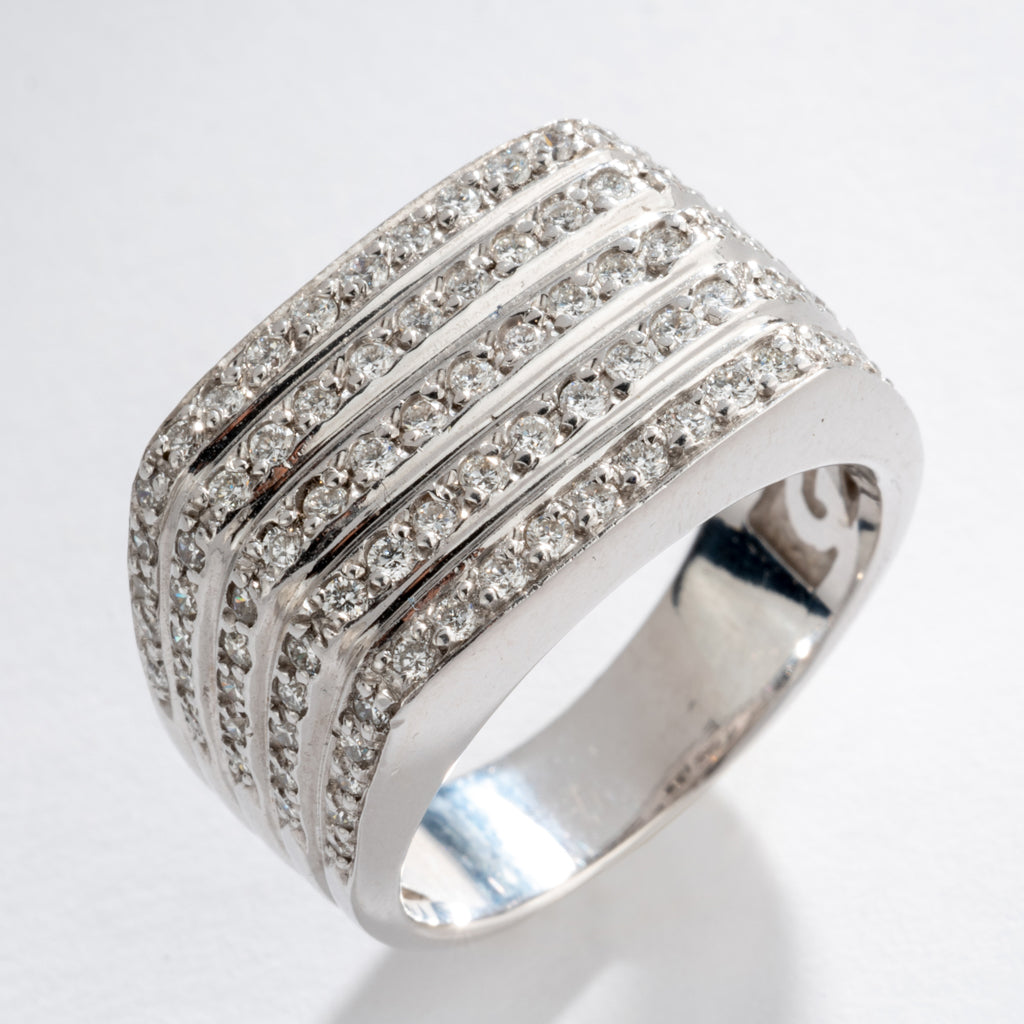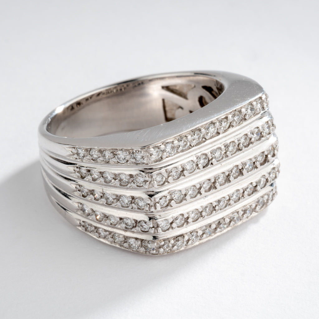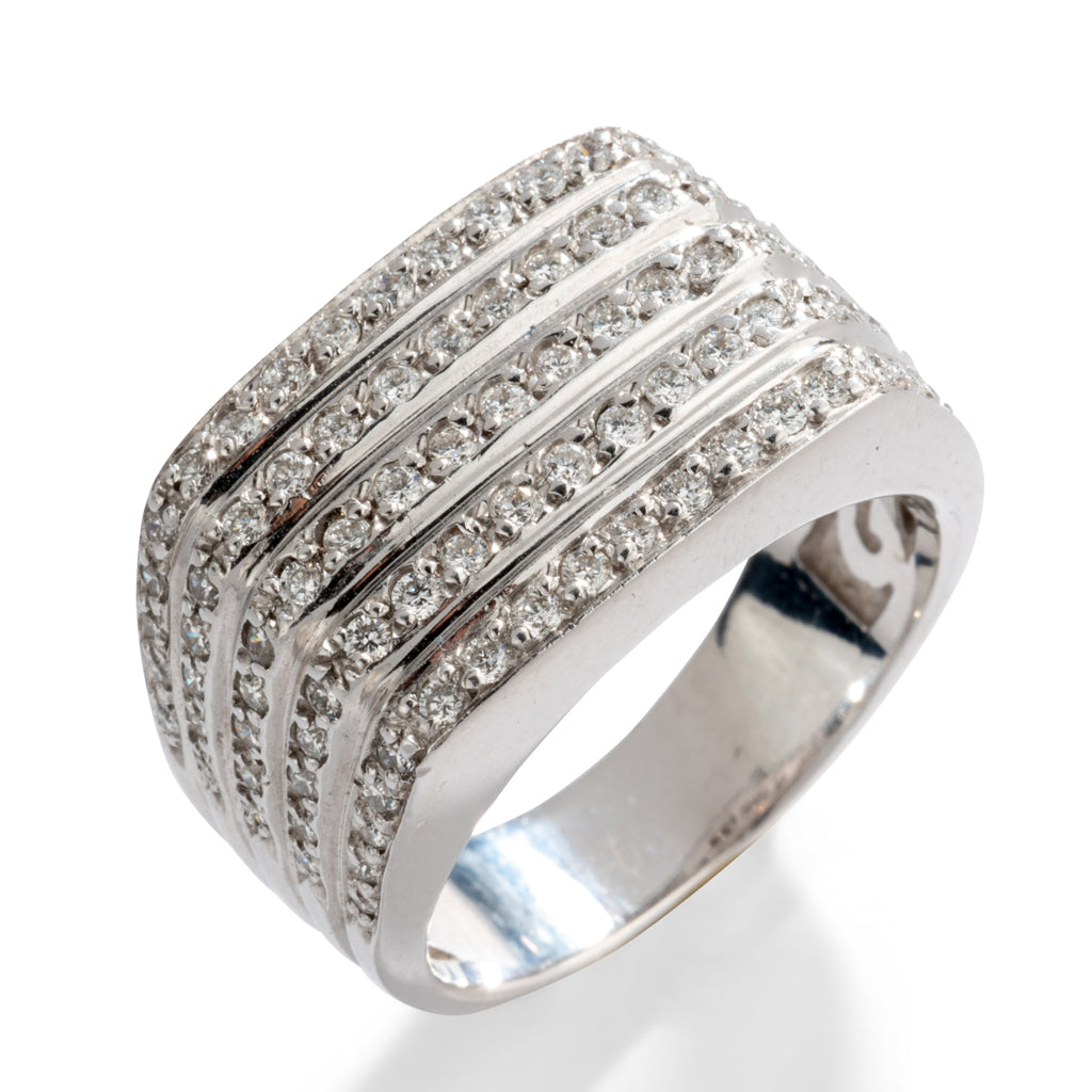 Bague moderne rectangulaire en or gris et diamants pavée de diamant.
