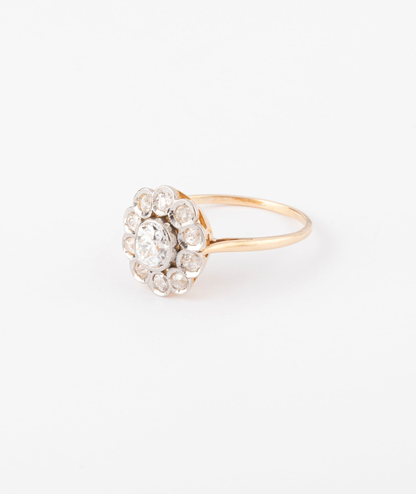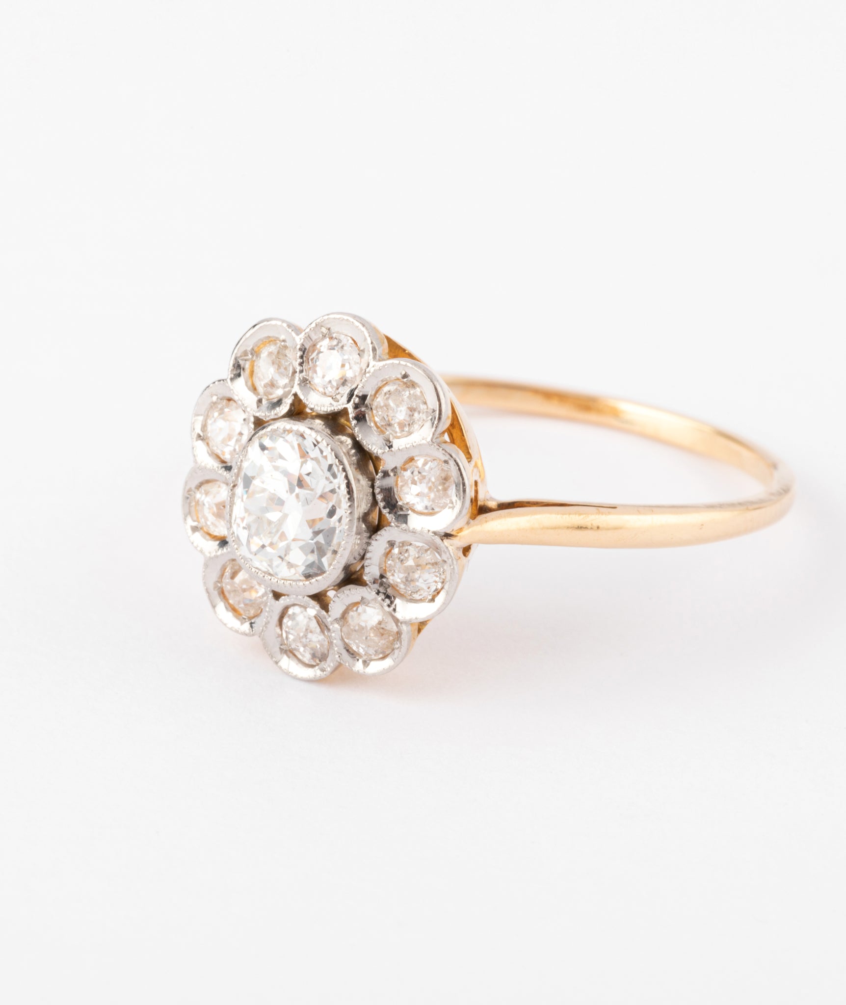 Bague marguerite ancienne en or 18k centrée d'un diamant taille ancienne 0,70carat dans un entourage totalisant env. 0,70ct.