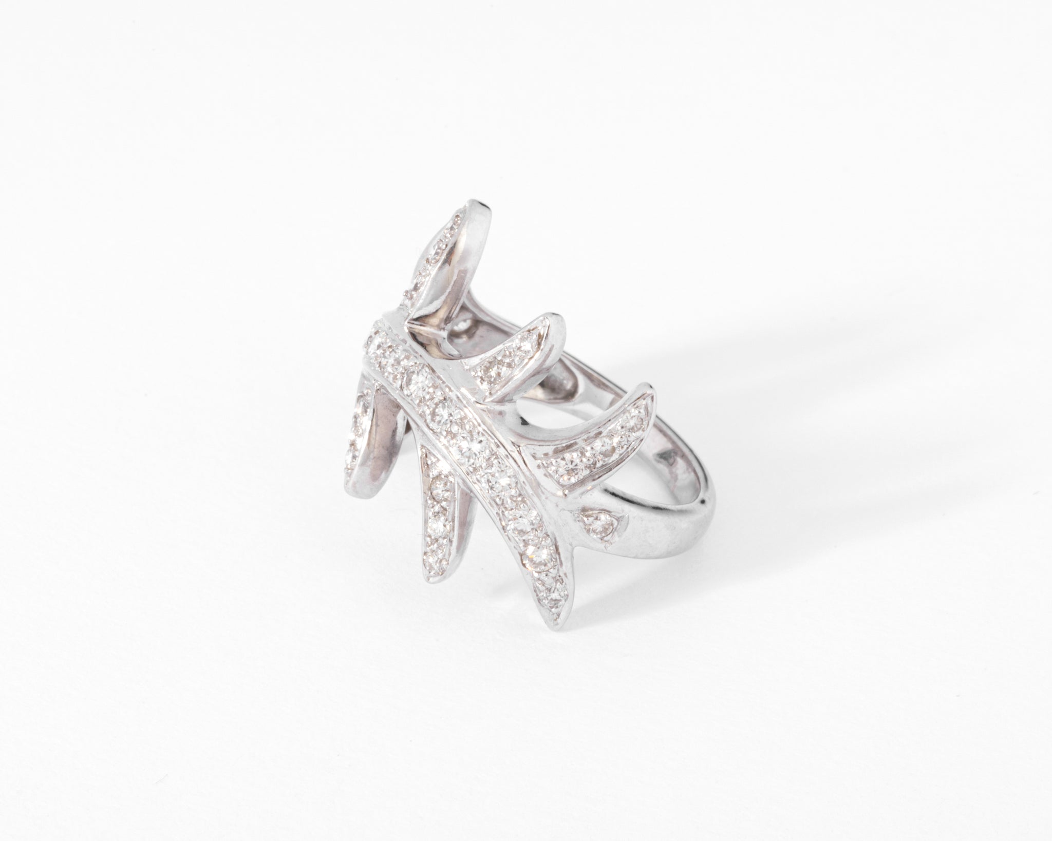 Bague or gris formant des feuilles entièrement pavées de diamants.