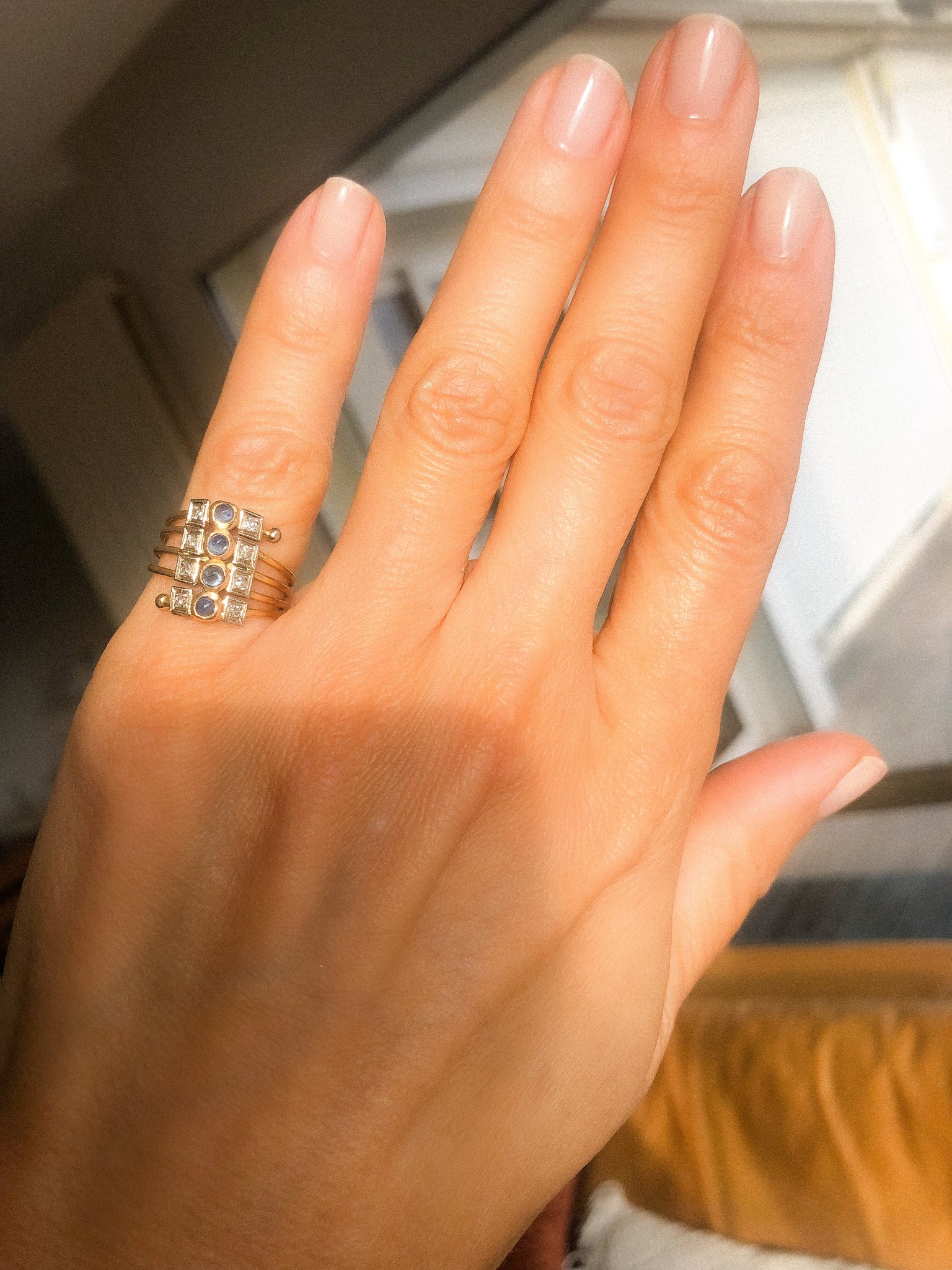 Bague 1910 succession de fil d'or orné de 5 motifs avec saphir et diamants de chaque coté.