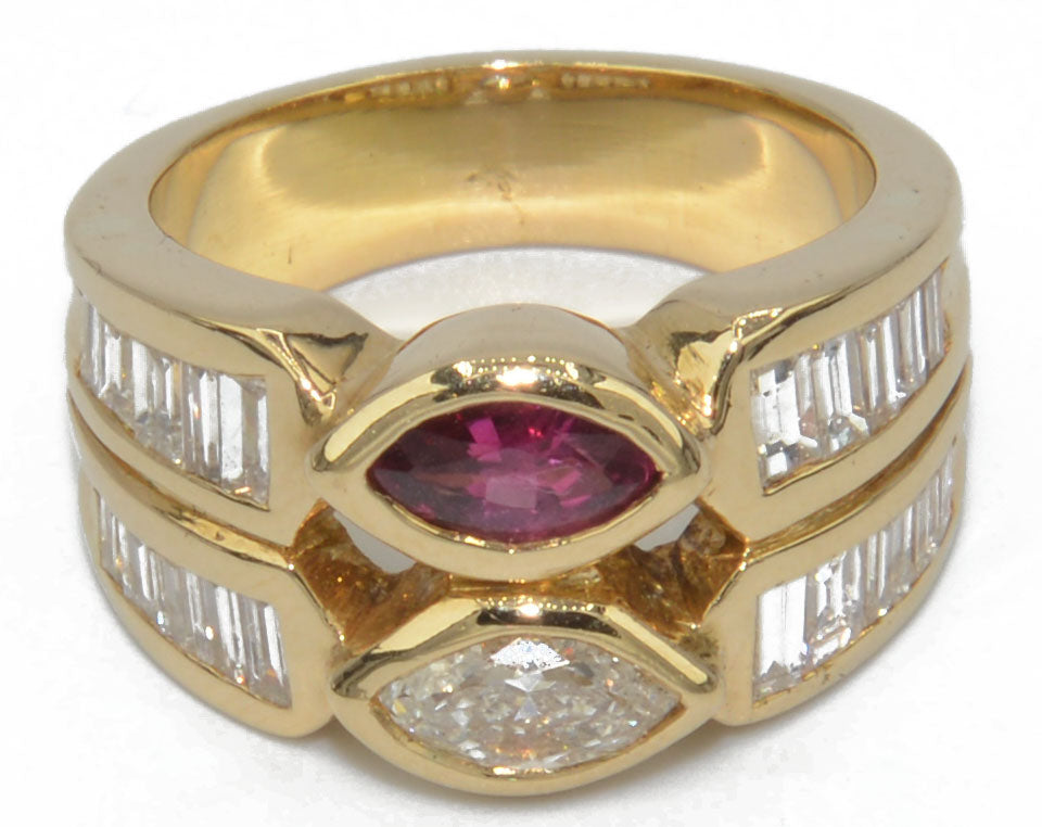 Bague or jaune en toi et moi joliment ornée de diamant et rubis de forme navette sur une descente de diamant navette.