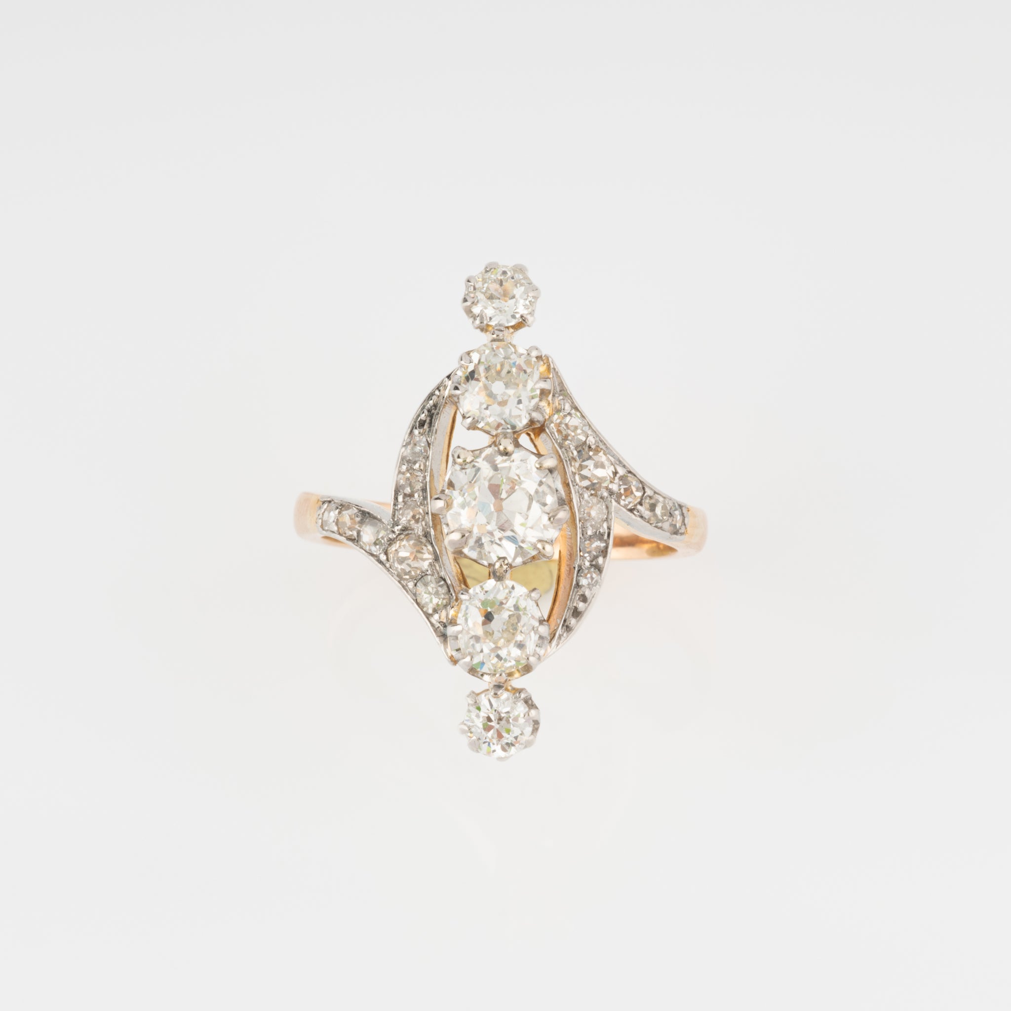 Bague ou marquise diamants ornée de 5 diamants taille ancienne, ornée de chaque côté de petits diamants taille anciennes.