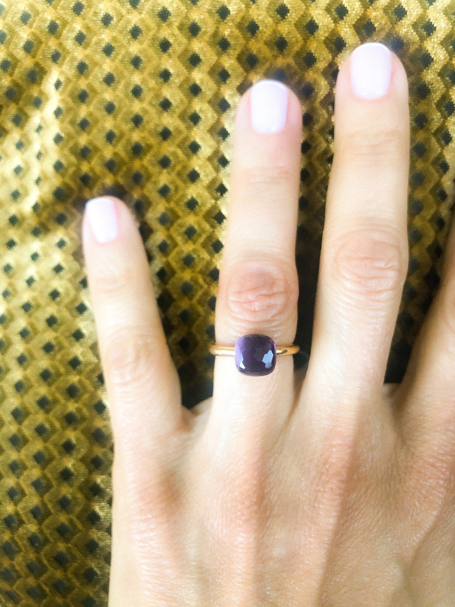 Très jolie bague de la maison italienne Pomellato modèle Nudo PM en or rose ornée en son centre d'un cabochon facetté en améthyste, sur un élégant anneau bombé.