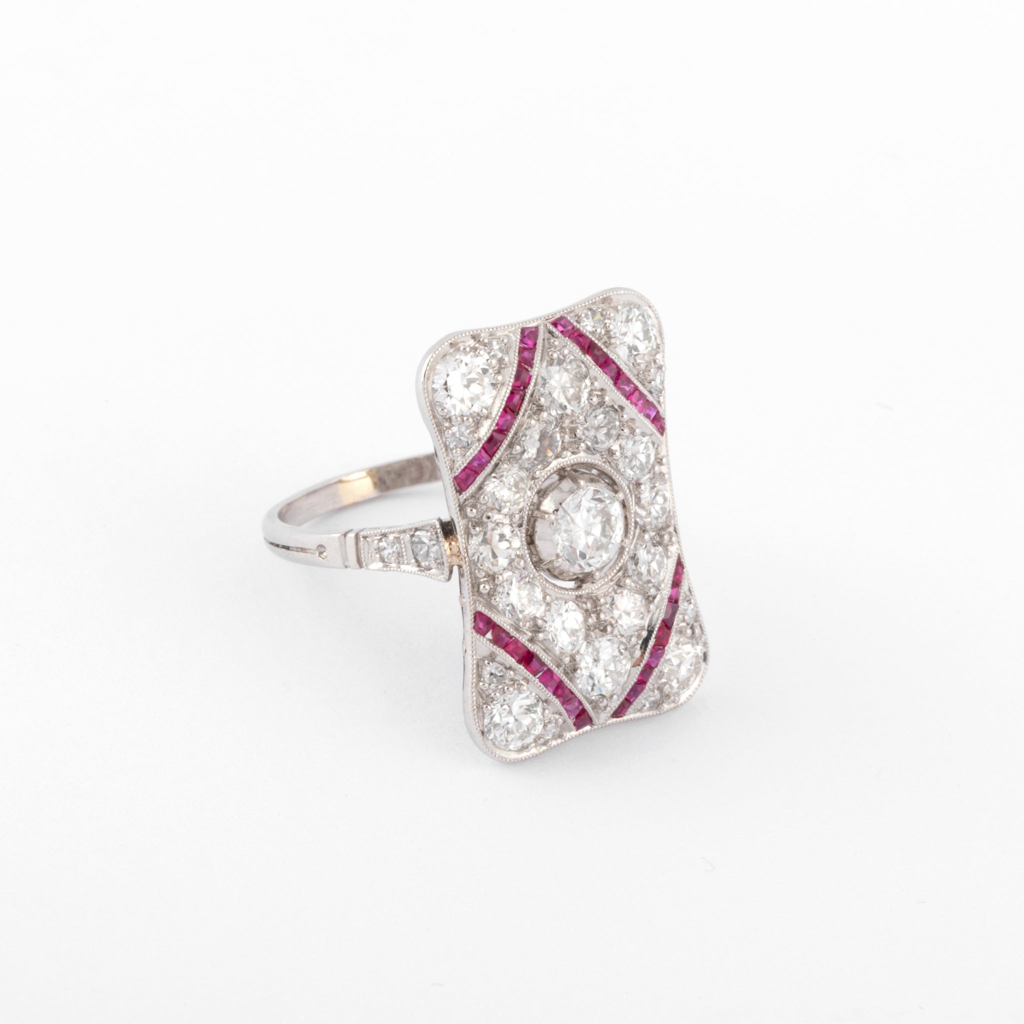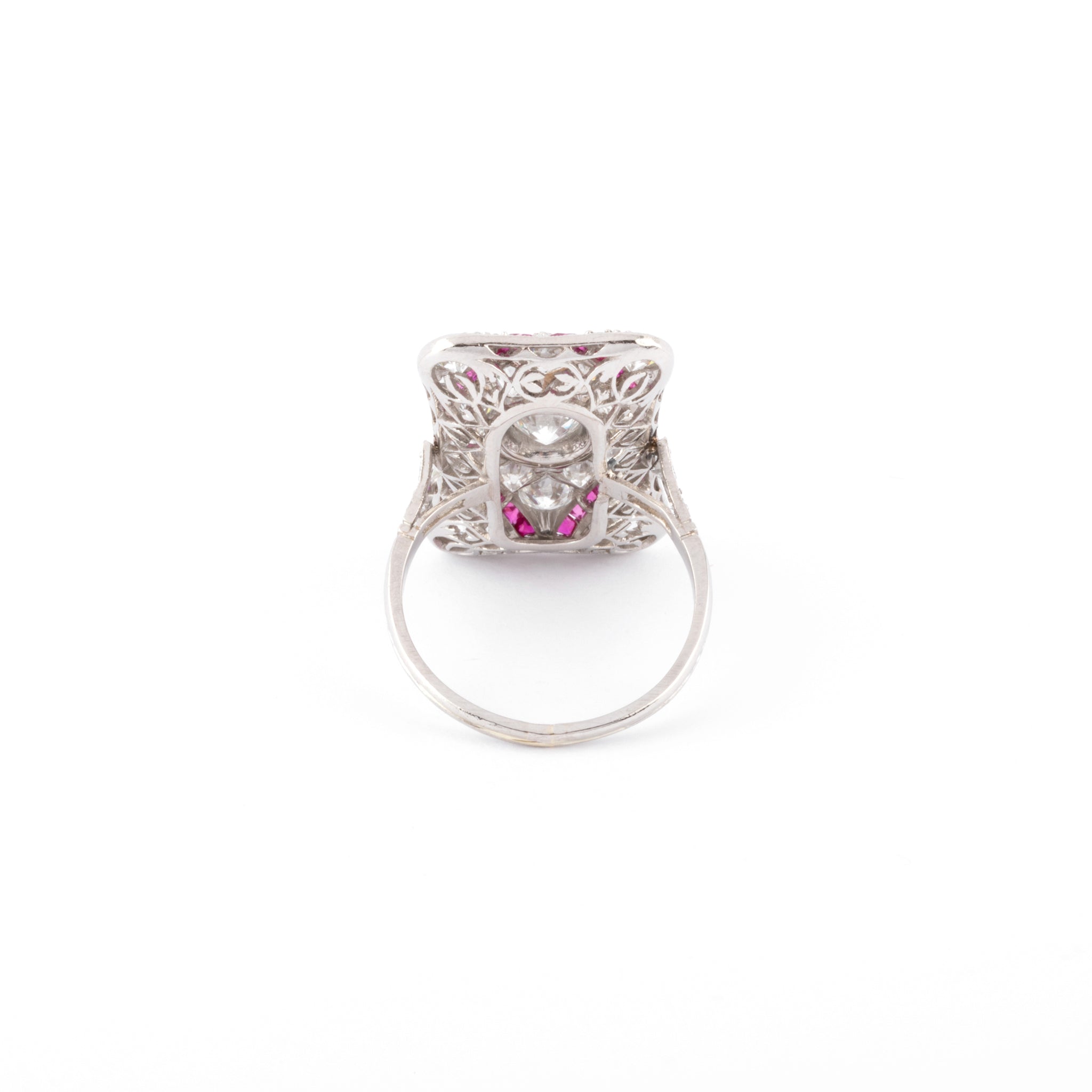 Bague platine, diamants et rubis rectangulaire, ornée en son centre d'un diamant taille ancienne d'environ:0,40 cts.