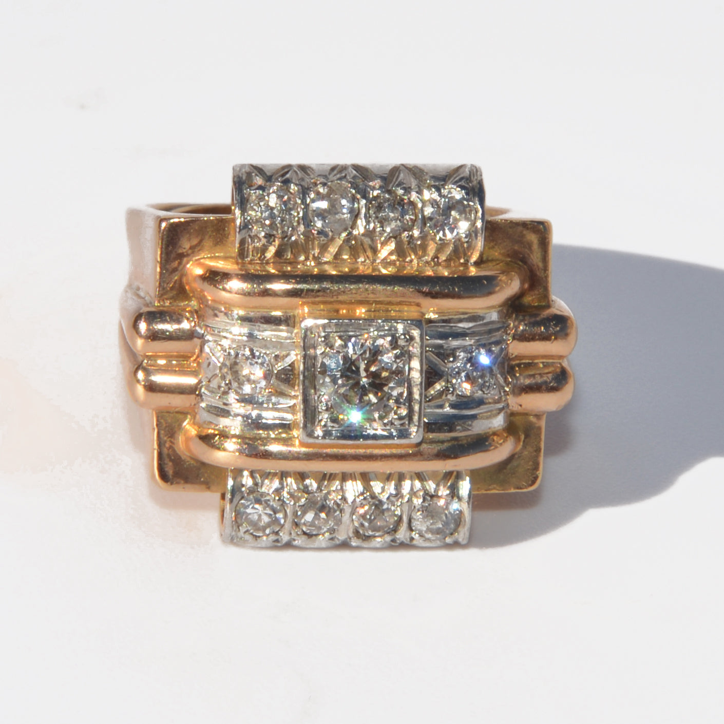 Bague tank en platine et or datant des années 1945-1955 en son centre un diamant taille taille ancienne de 0,20 ct, soulignée d'une ligne de diamants de chaque cotés.