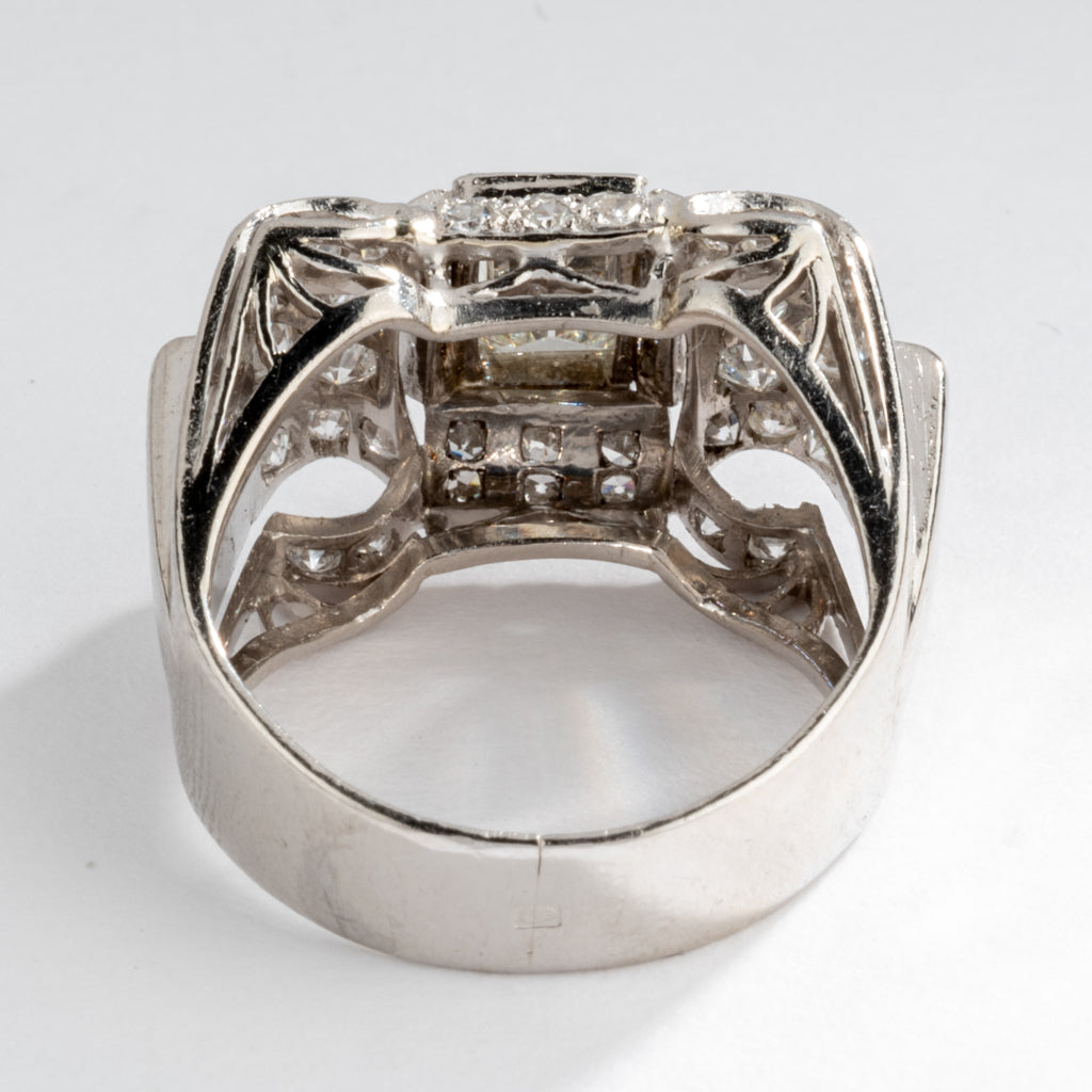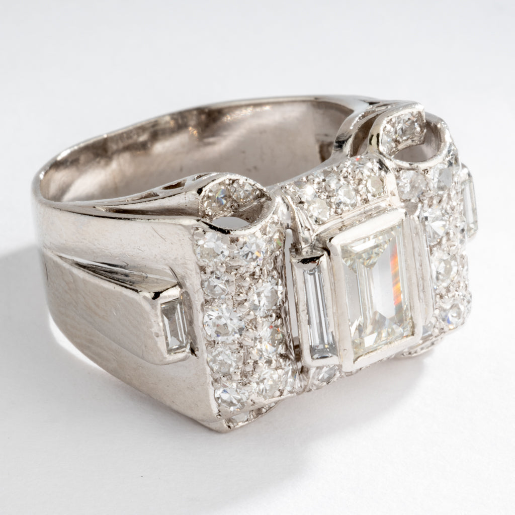 Bague rectangulaire en platine et diamant Art Déco ornée d'un diamant taille Emeraude et diamant taille brillant.