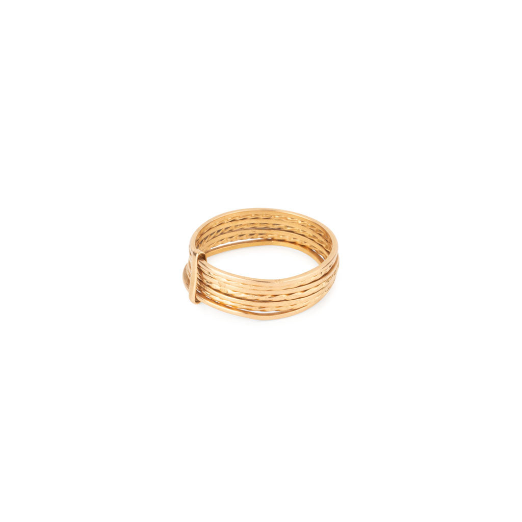 Bague semainier en or jaune alterné de 7 anneaux en or lisse et or ciselé, le tout retenu par une barrette en or.