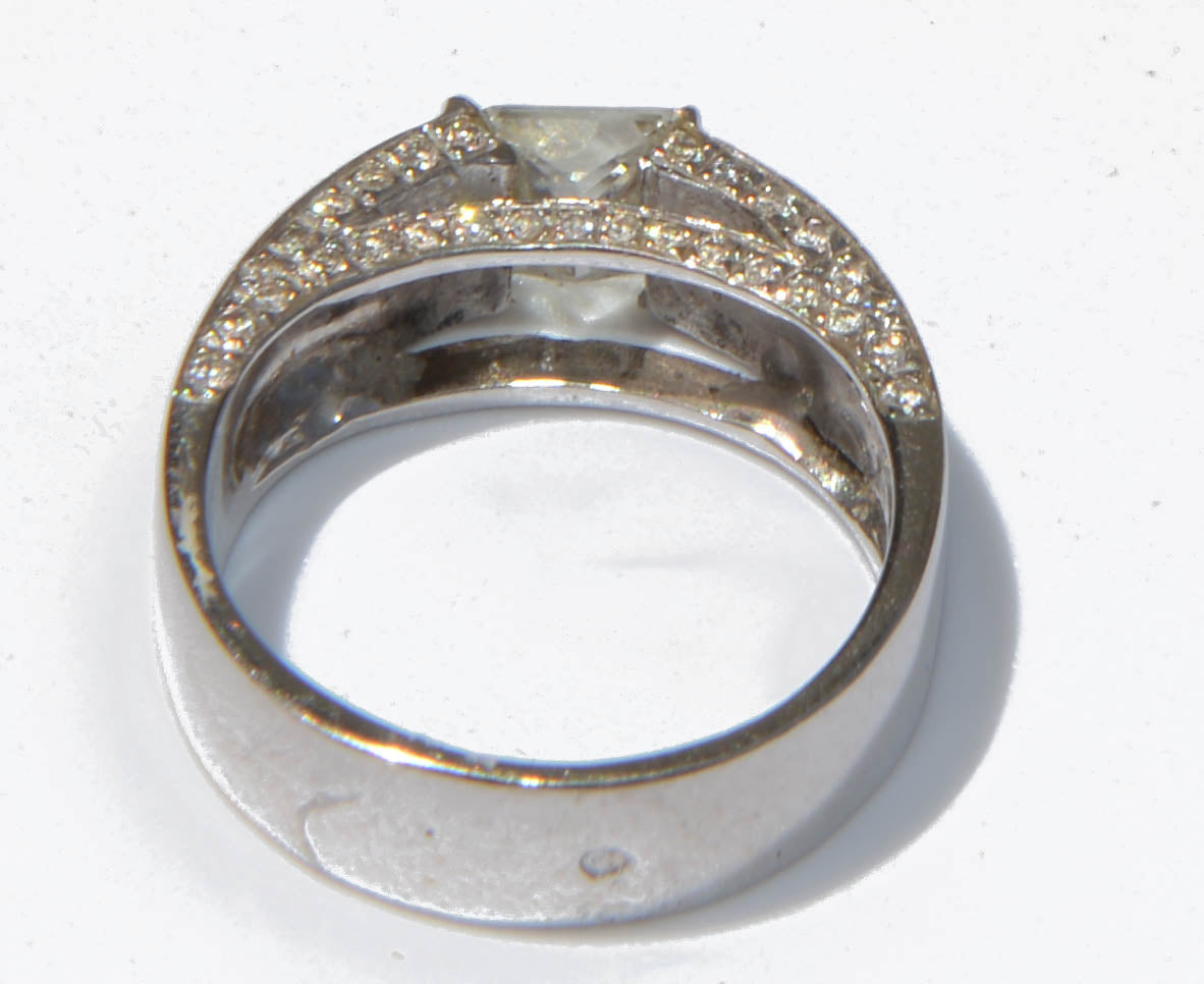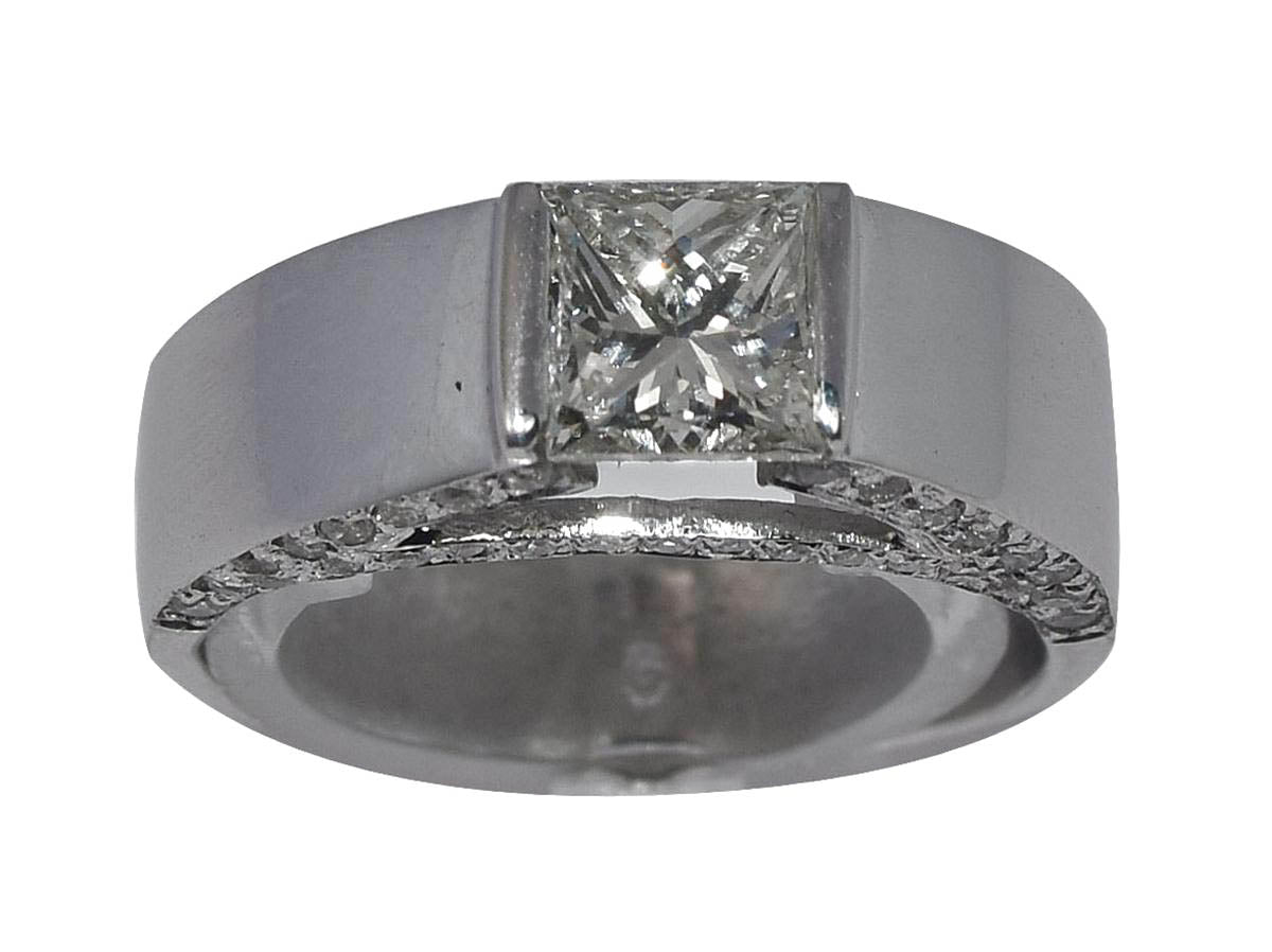 Bague solitaire en or gris ornée d'un diamant taille princesse couleur supposé K ,la monture est pavé de diamant sur les 2 côtés .