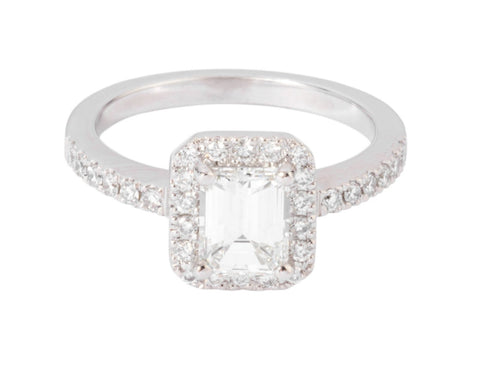 Bague solitaire en or gris ornée d'un diamant taille émeraude