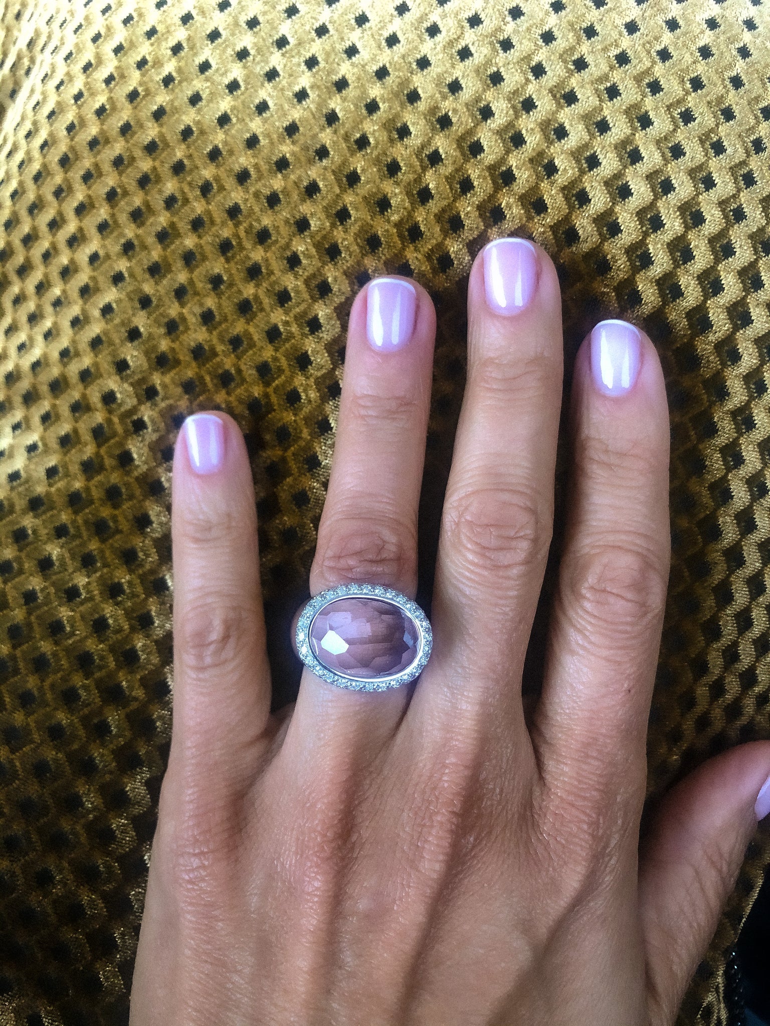 Bague or rose sablé signée de la maison italienne Pomellato modèle iceberg ornée d'un cabochon de morganite ovale facettée rehaussée d'une belle bordure bombée en or blanc entièrement pavée de 2 rangs de diamants de taille brillant.