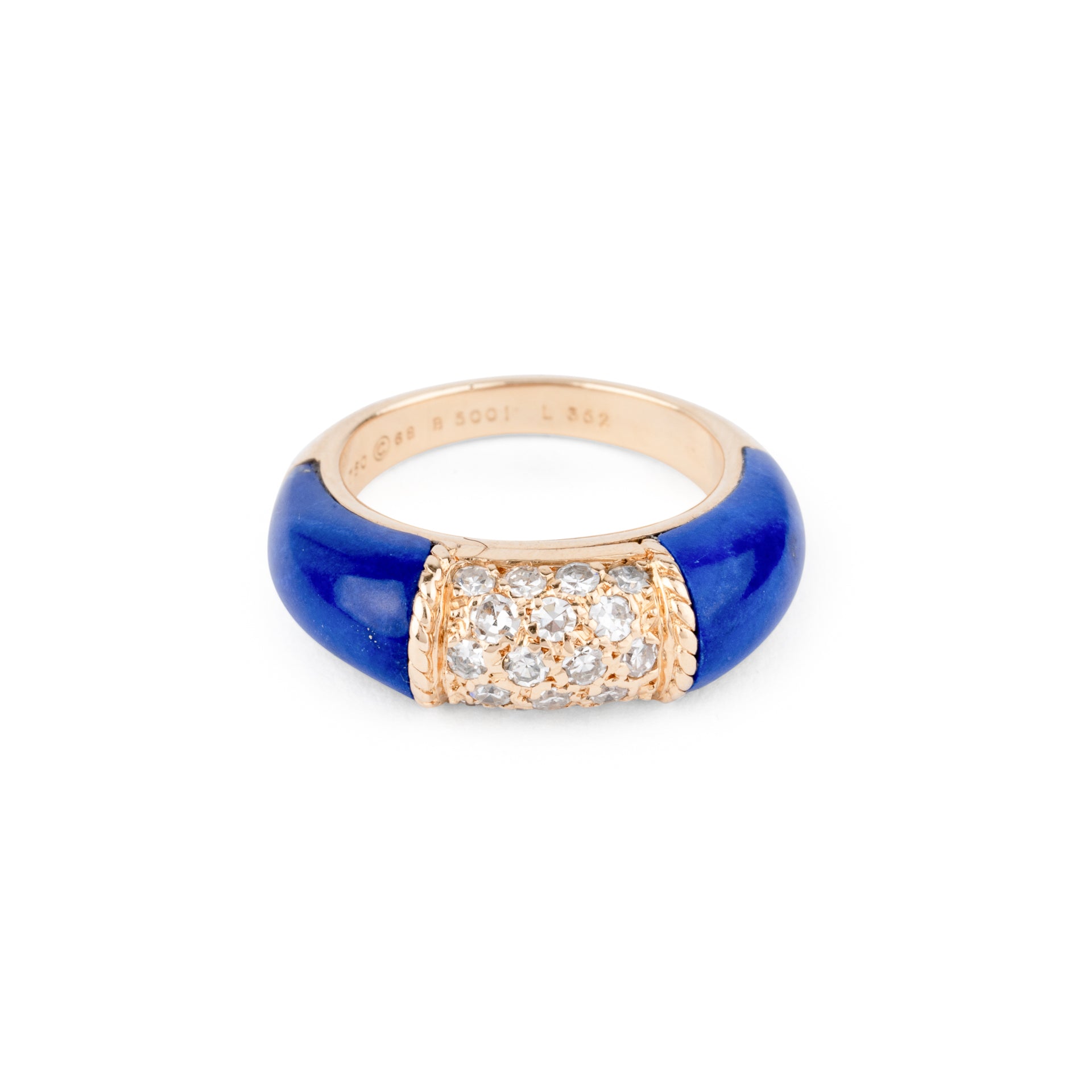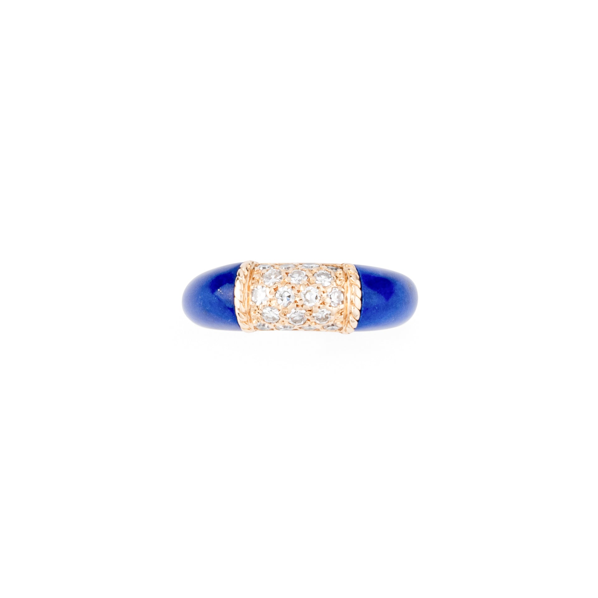 Bague Van Cleef & Arpels, collection Philippine en or jaune et lapis-lazuli et diamants, composée d'un anneau en chute en or jaune, ornée en son centre d'un très beau pavage de diamants de taille brillant pesant environ 0.35 carat, réhaussée de 2 magnifiques cabochons bombés en lapis-lazuli.