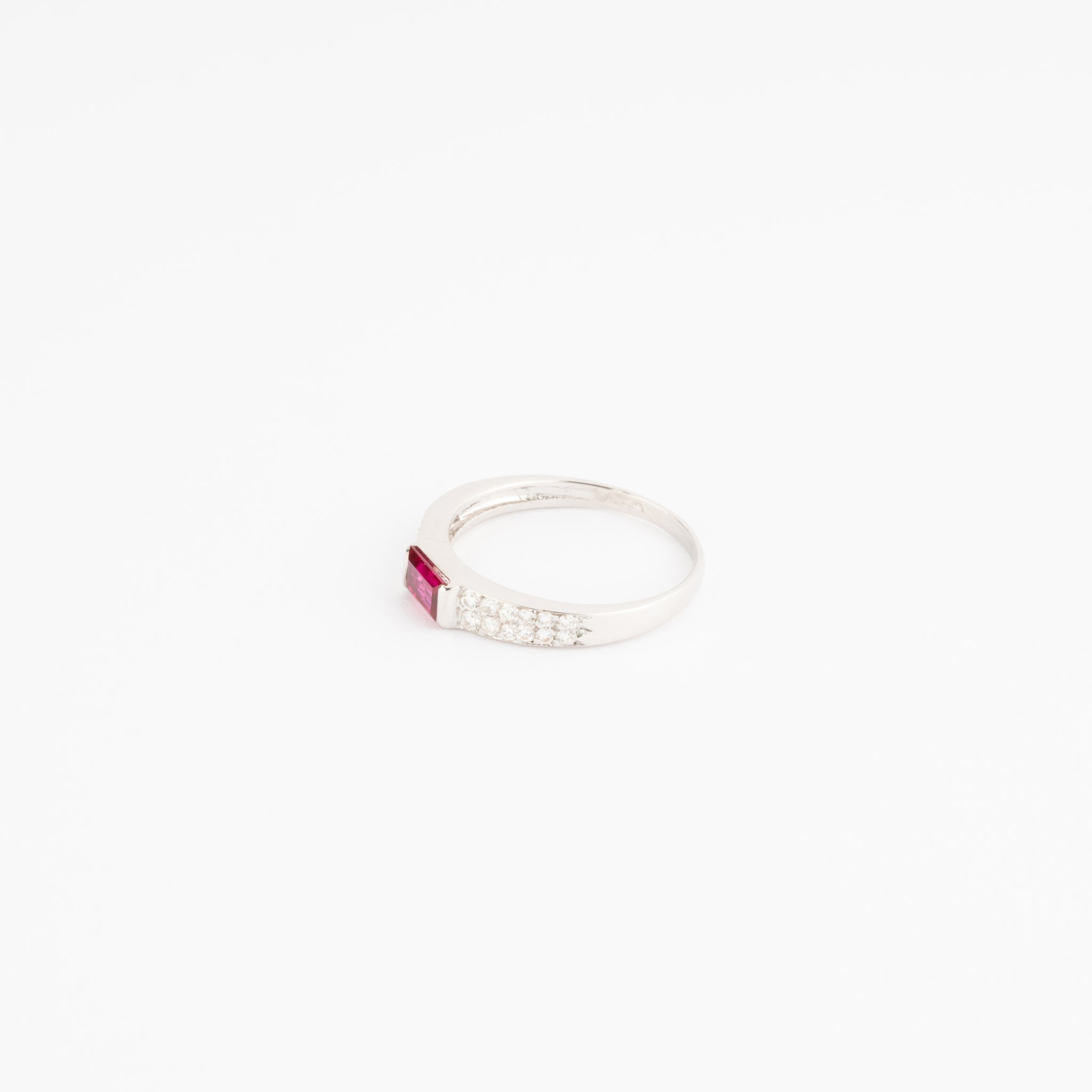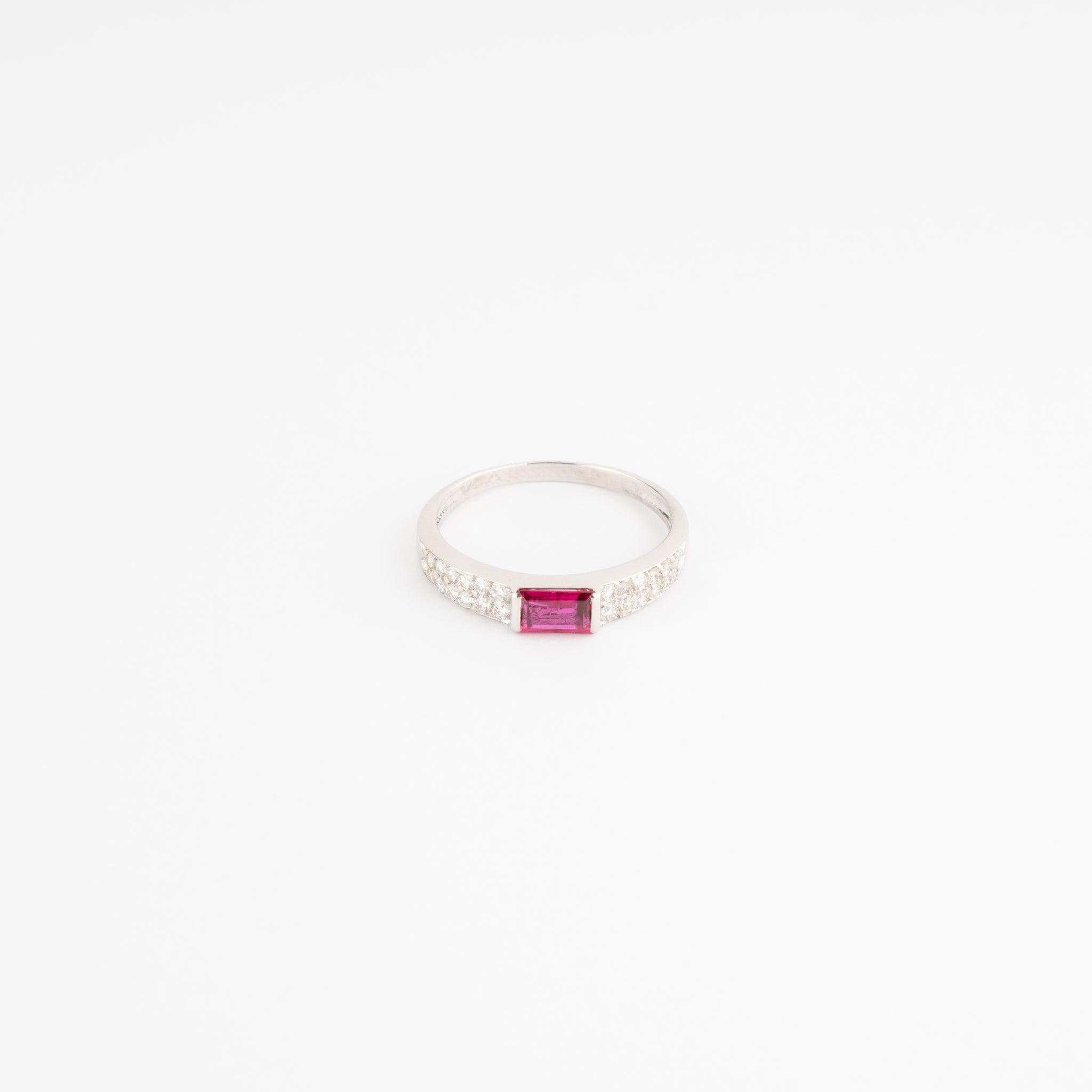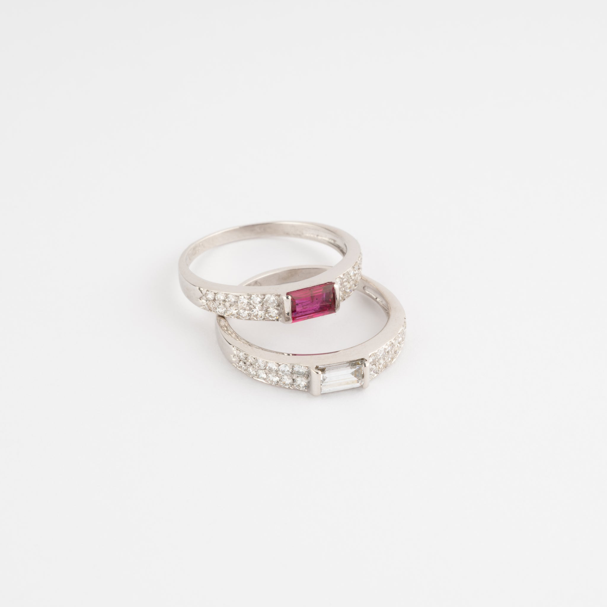 2 Bagues de la maison Van Cleef and Arpels ornées pour l'une d'un diamant taille émeraude et l'autre d'un rubis taille émeraude d'environ 0,10ct chacun sur une double descente de diamants de chaque côté.