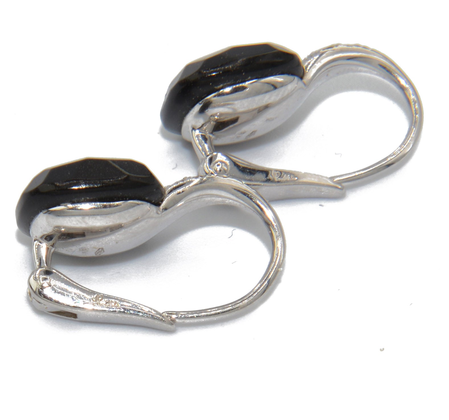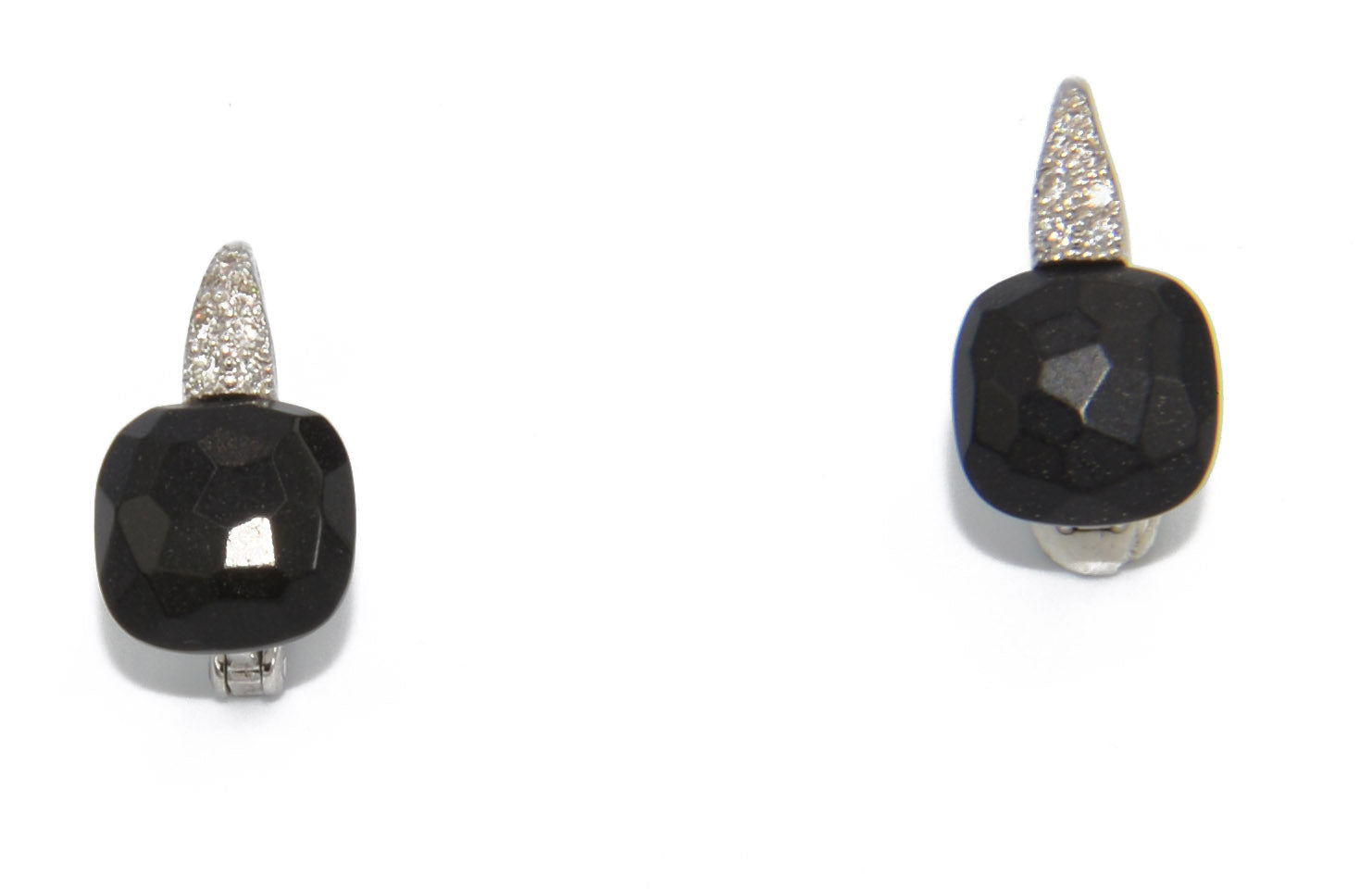 Paire de boucles d'oreilles Pomellato ,modèle Capri en or blanc et diamants, orné d'un onyx carré facetté. L'anneau sur le dessus est pavé de diamant.
