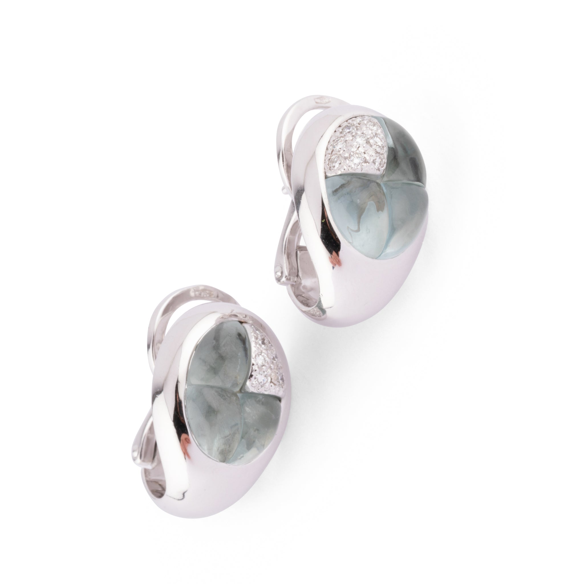 Paire de boucles d'oreilles collection Mosaïco, agrémentés chacun de trois cabochons d'aigue marine et d'un motif pavé de diamants taille brillant.