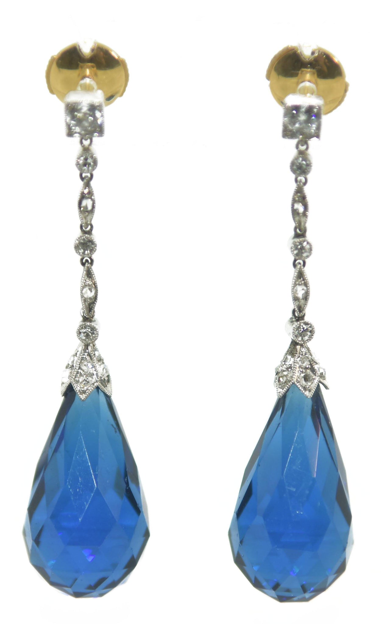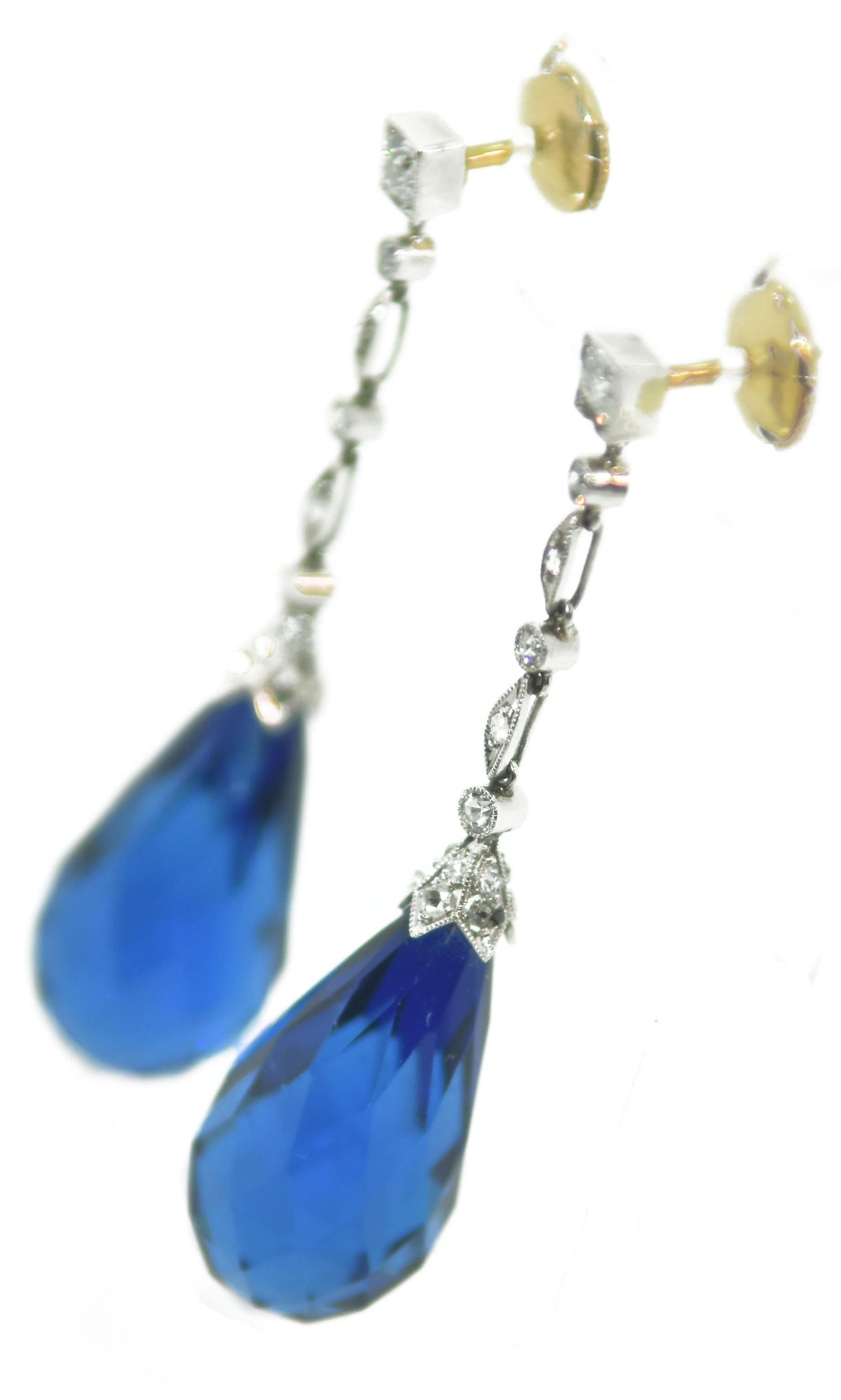Belle paire de boucles d'oreilles en platine et or datant des années 1930 ornée de diamants taille ancienne totalisant environ 0,50ct ornée de 2 perles briolettées en verre bleue.