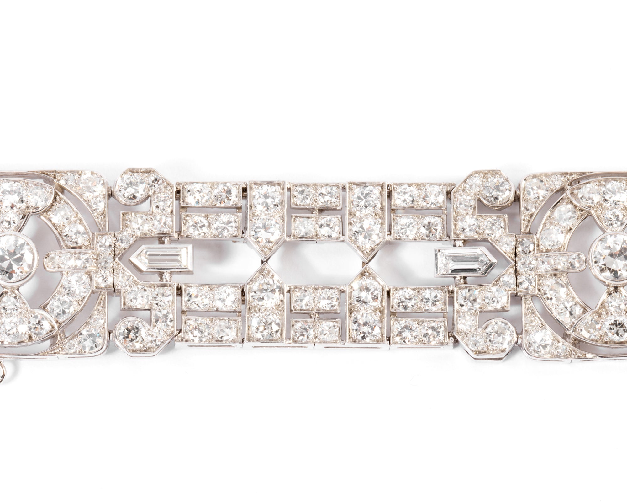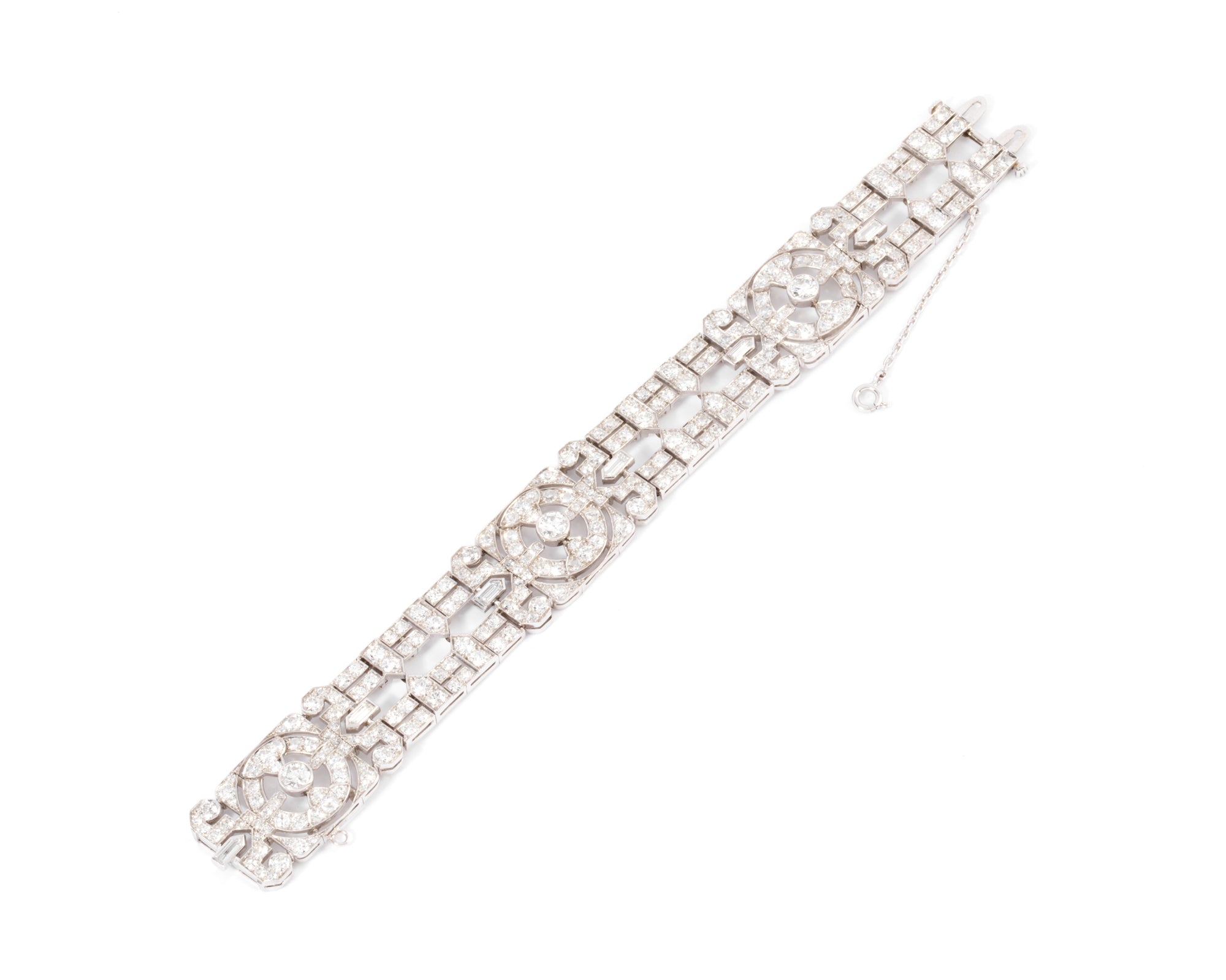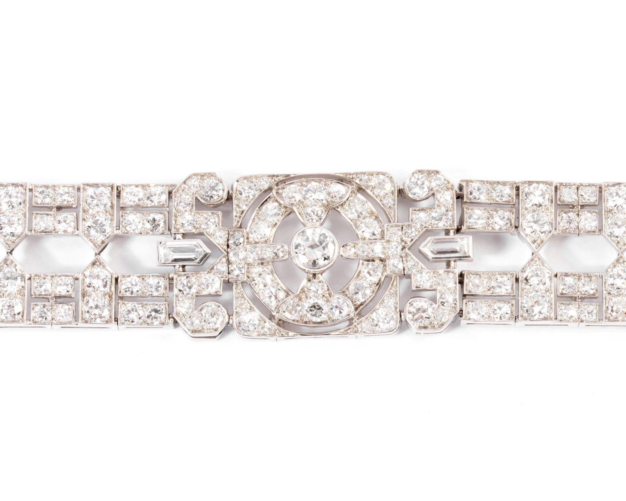 Bracelet Art Déco en platine entièrement pavé de diamant taille ancienne et taille 8/8,trois motifs carrés sur chaque motifs 3 diamants plus important d'environ 0,60ct chacun.