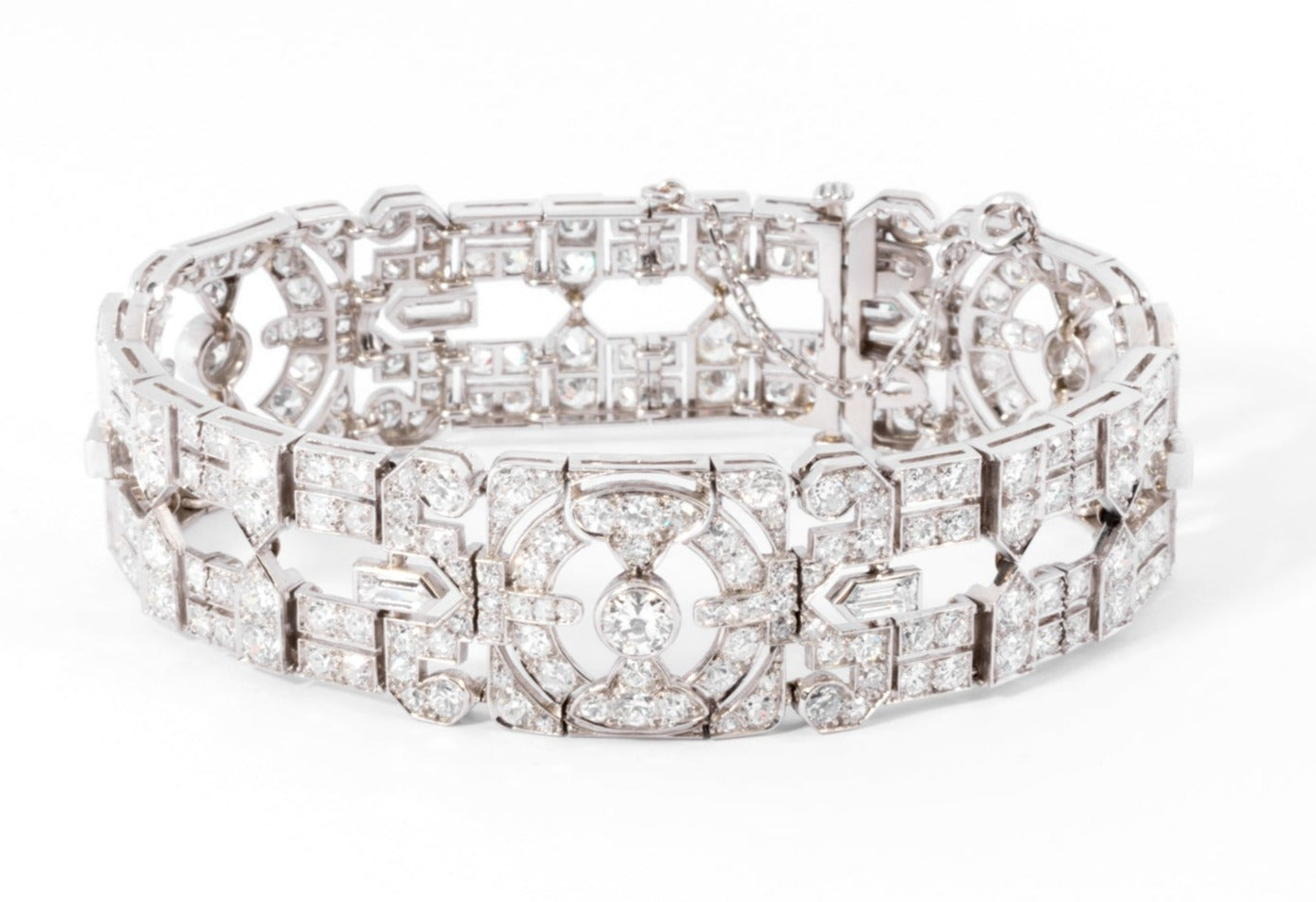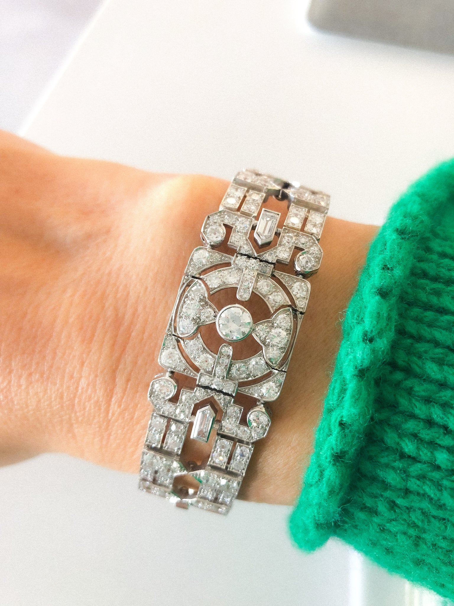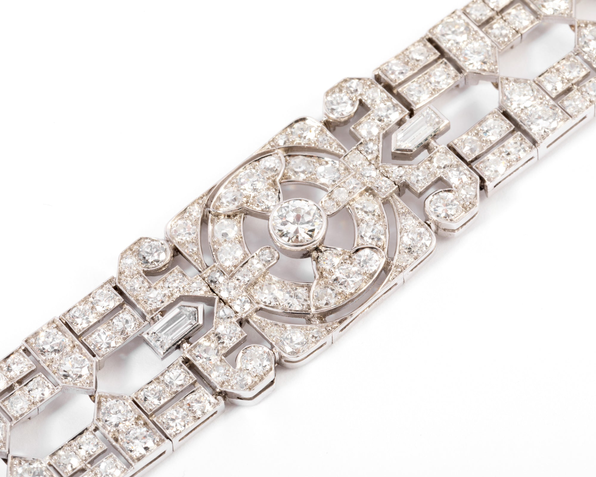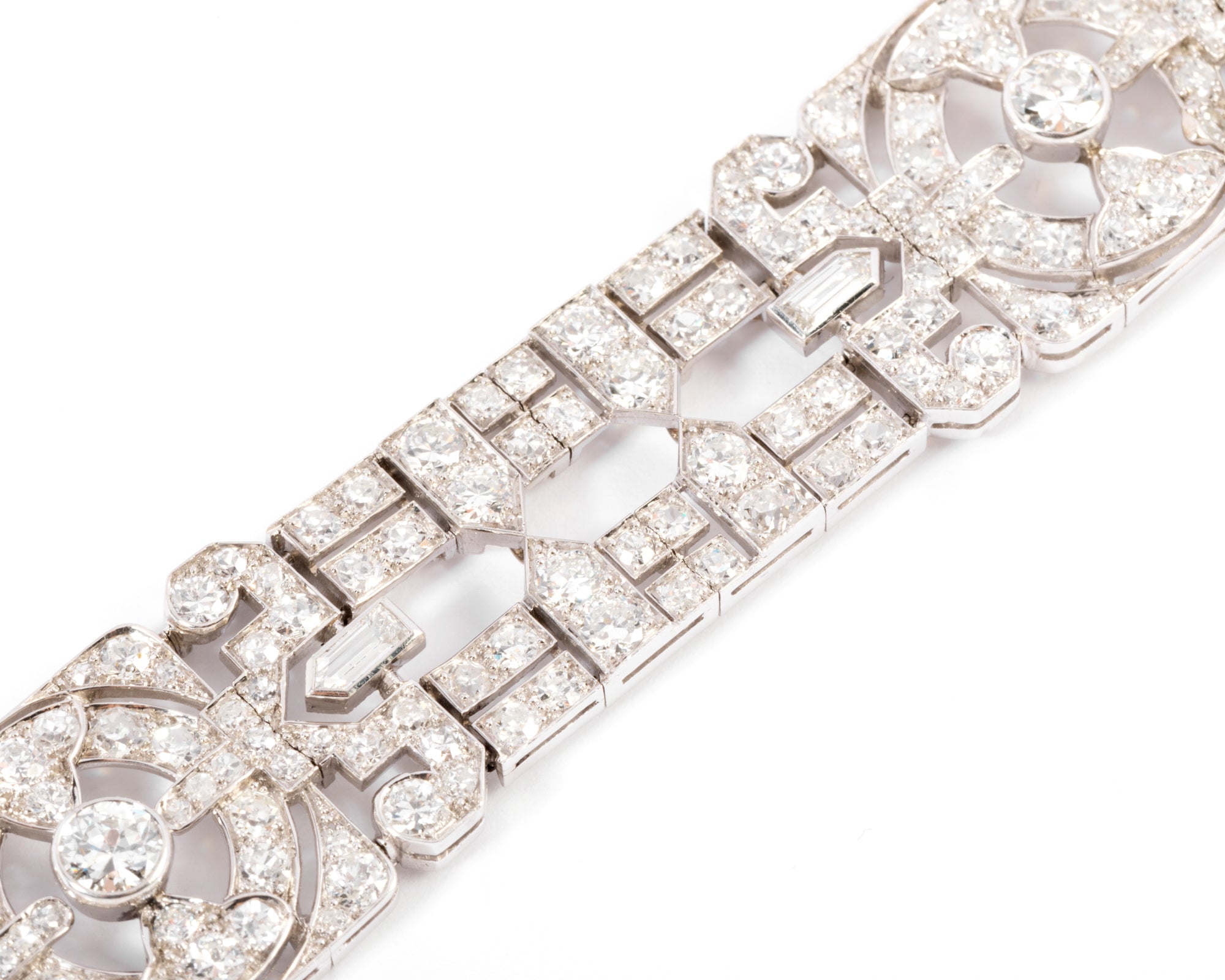Bracelet Art Déco en platine entièrement pavé de diamant taille ancienne et taille 8/8,trois motifs carrés sur chaque motifs 3 diamants plus important d'environ 0,60ct chacun.