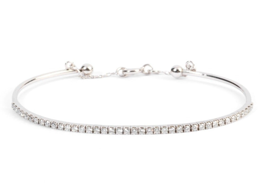 Bracelet demi jonc or gris et diamant sur le dessus avec chainette de sécurité.