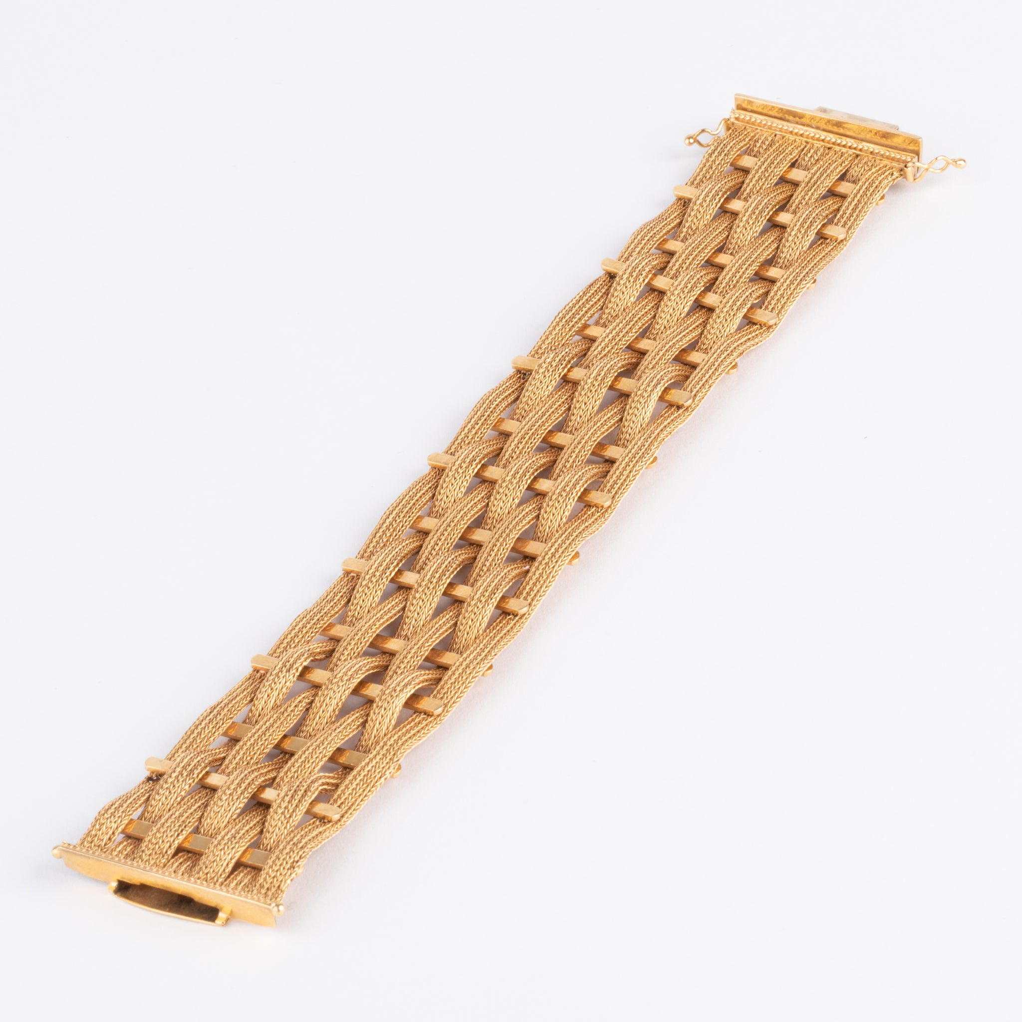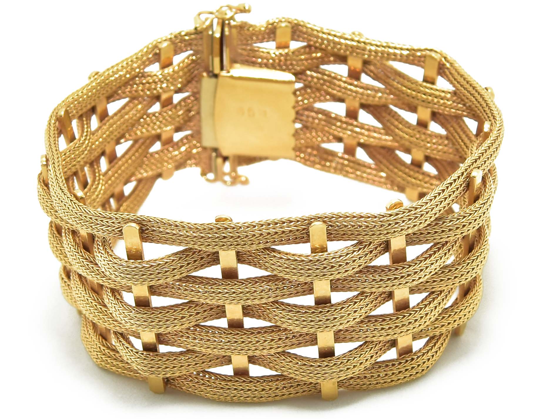 Large bracelet souple en or jaune 18k tissé, le tissage est intercalé de barrettes d'or.