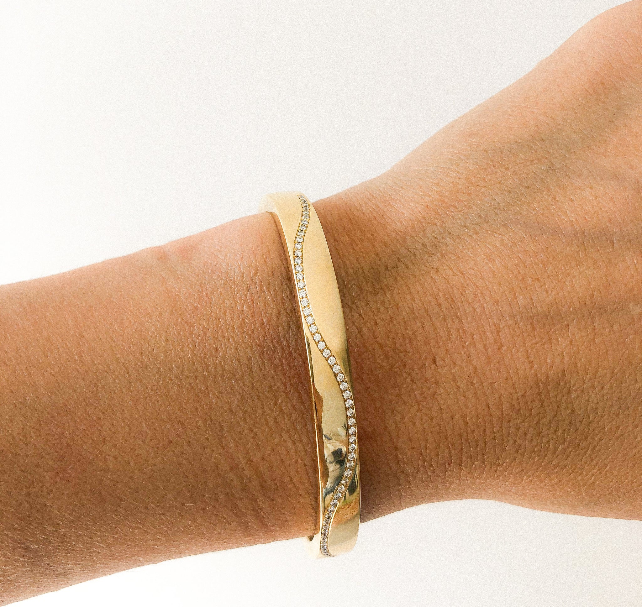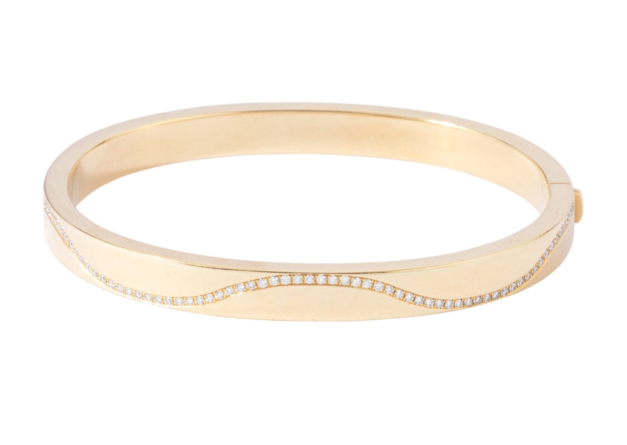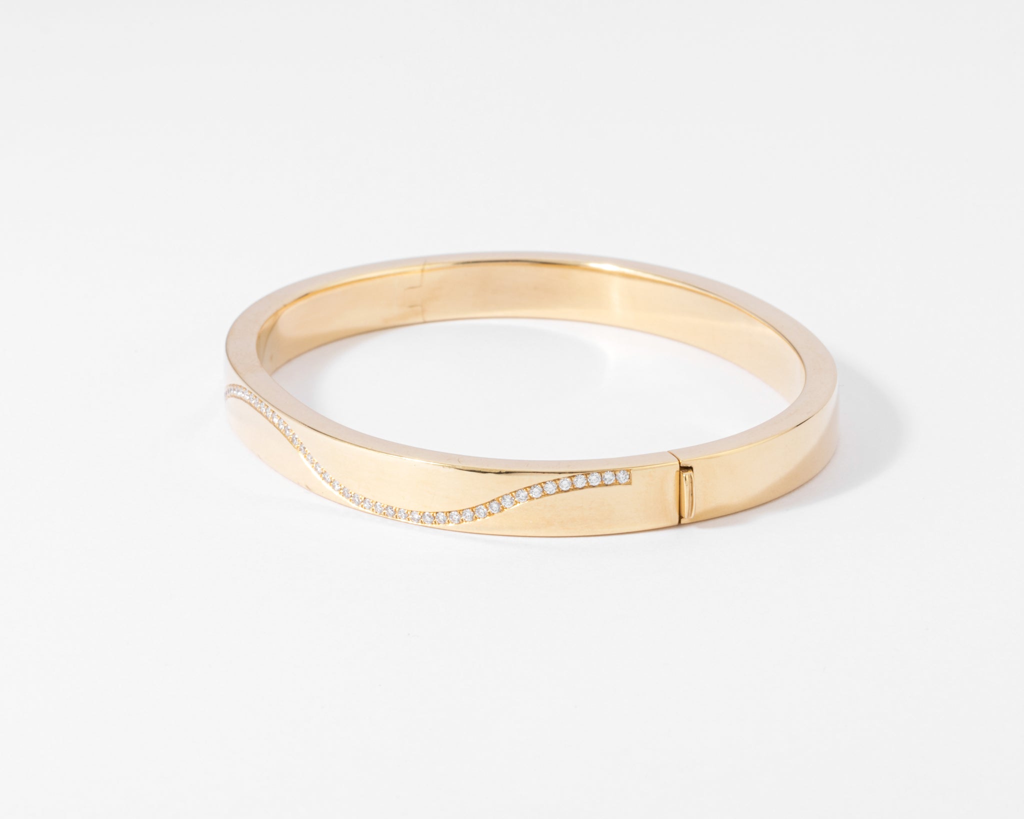 Bracelet jonc ouvrant or jaune orné d'un liseré de diamant en vague.