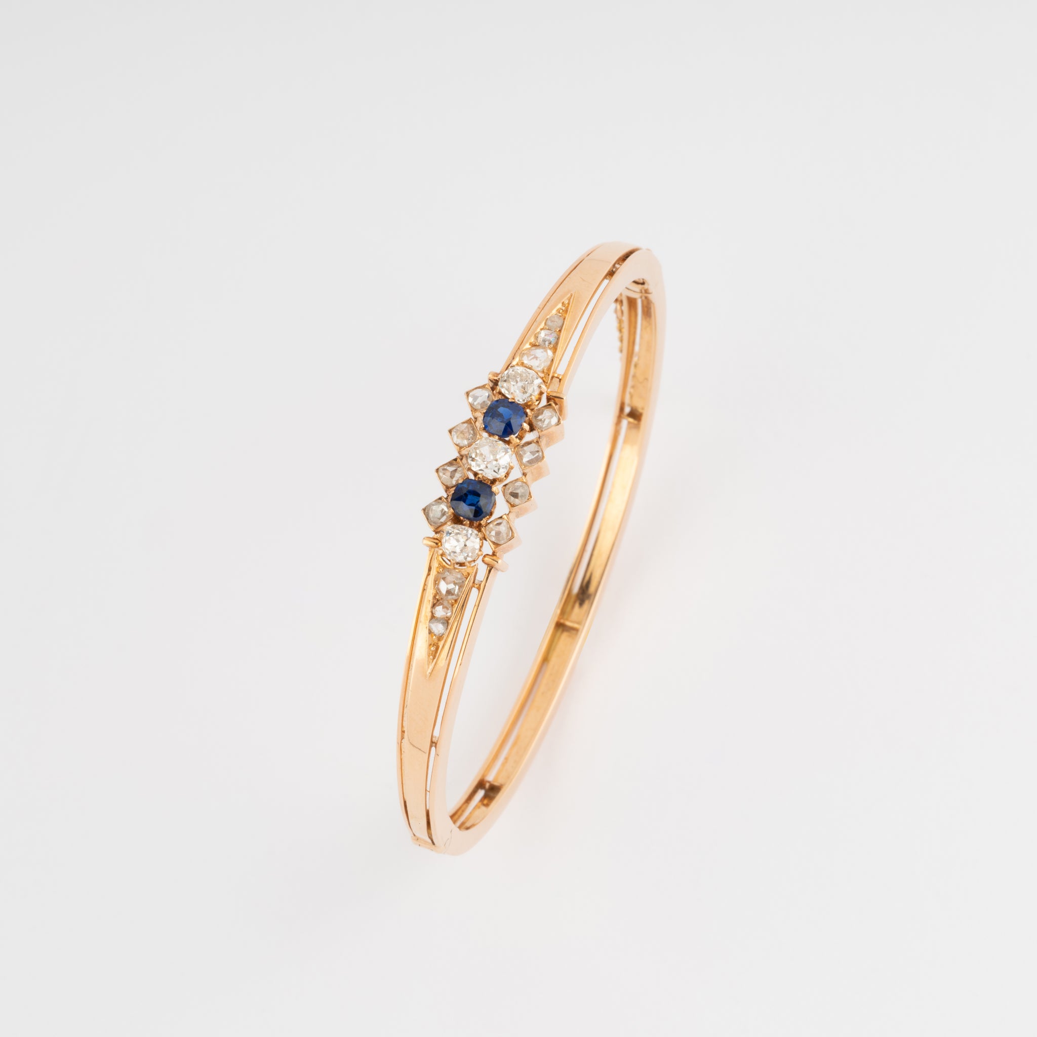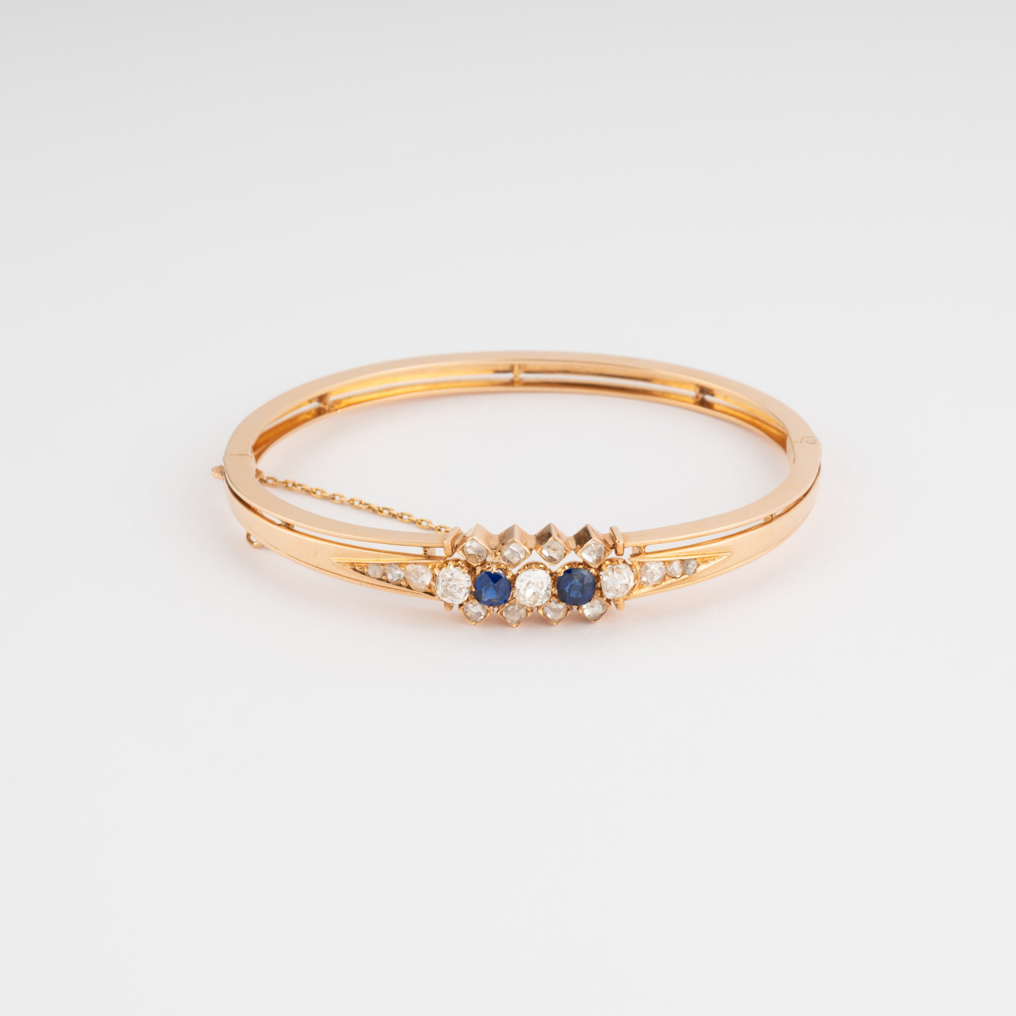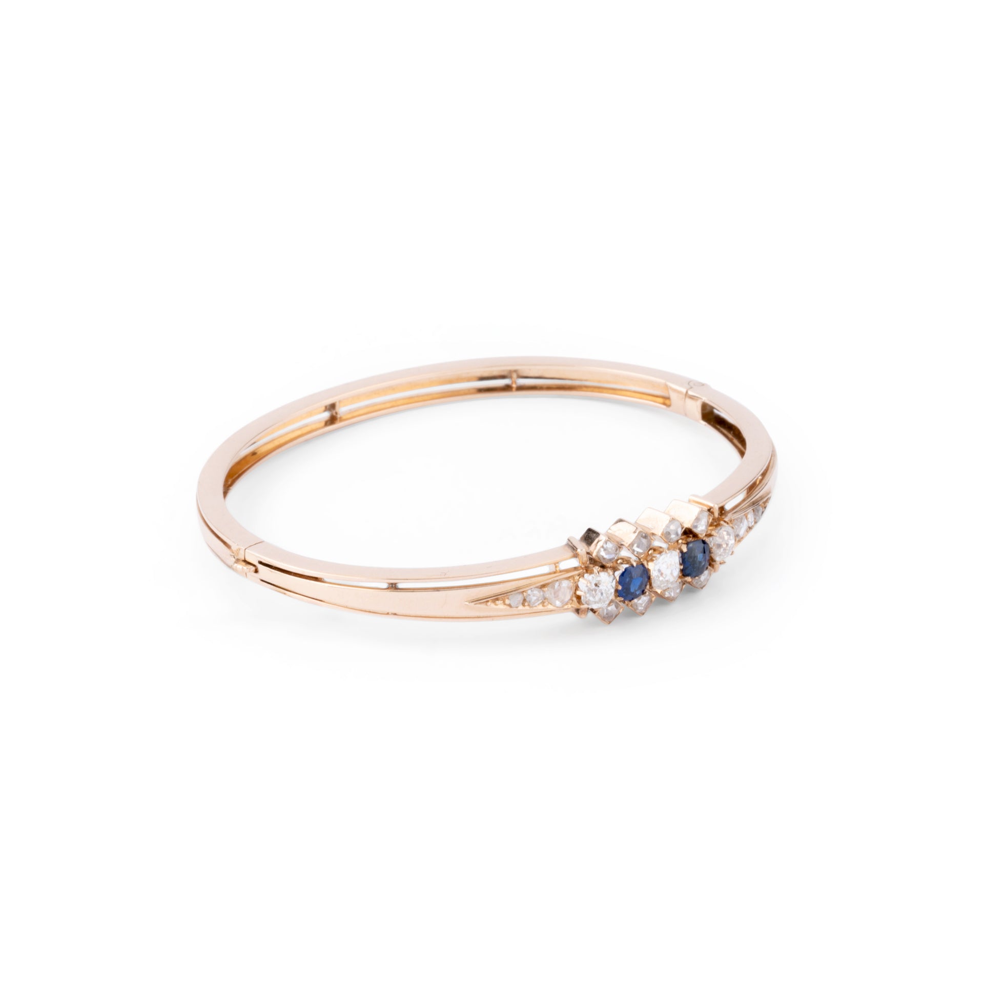 Bracelet or rose ouvrant sur le côté pavée sur le dessus de 2 motifs orné en diamants saphirs et diamants taille ronde Napoleon III .