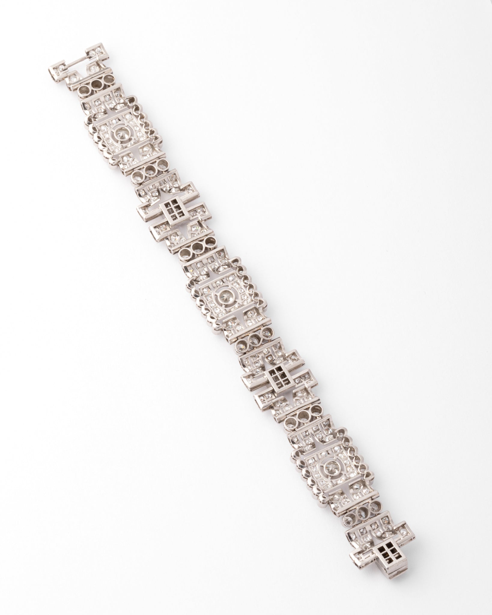 Bracelet en platine et diamant datant des années 1930 taille 8/8 et ancienne,à motifs rectangulaires, dont 3 plus gros diamants taille anciennes d'environ 0,50cts chacun .