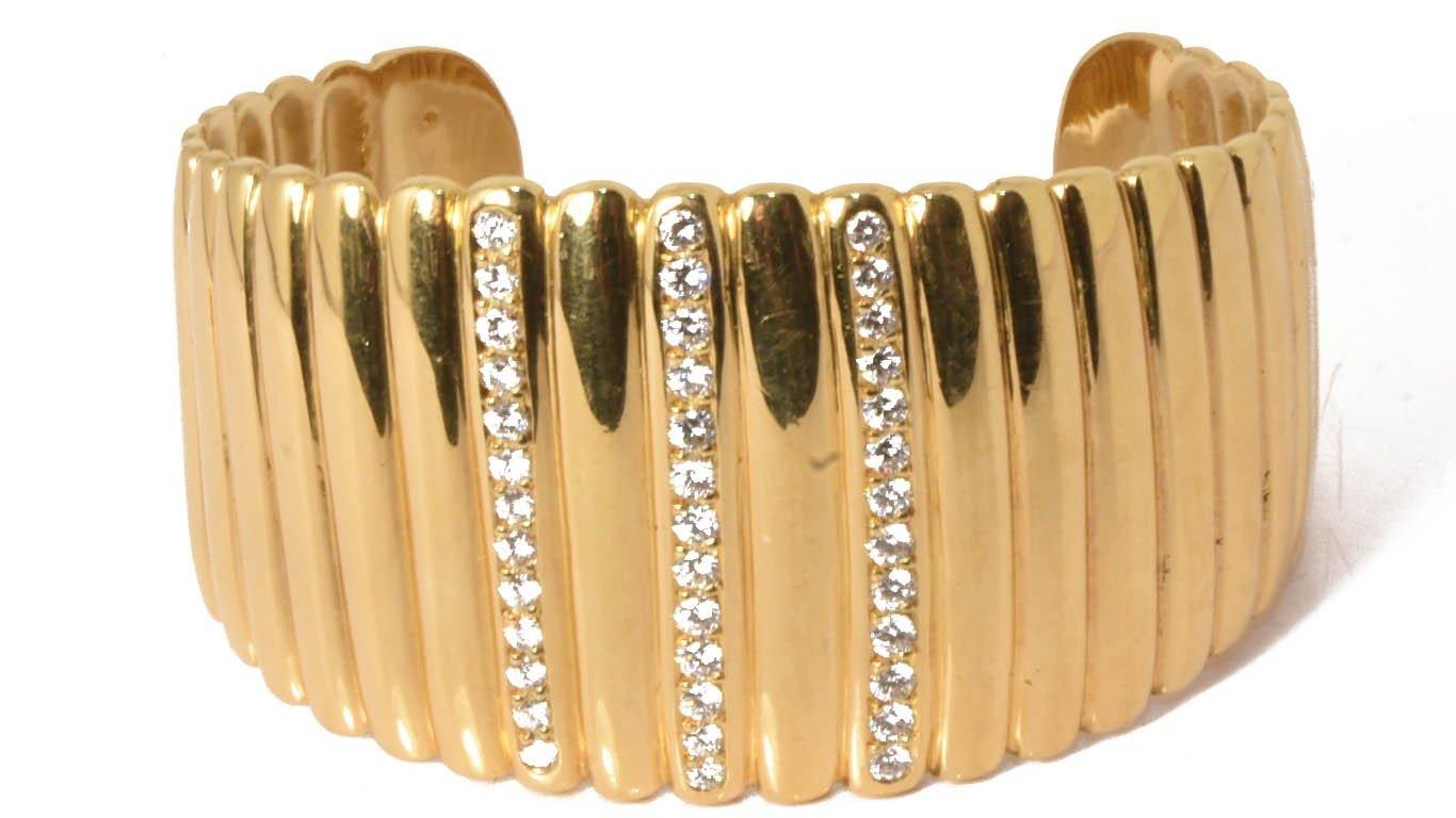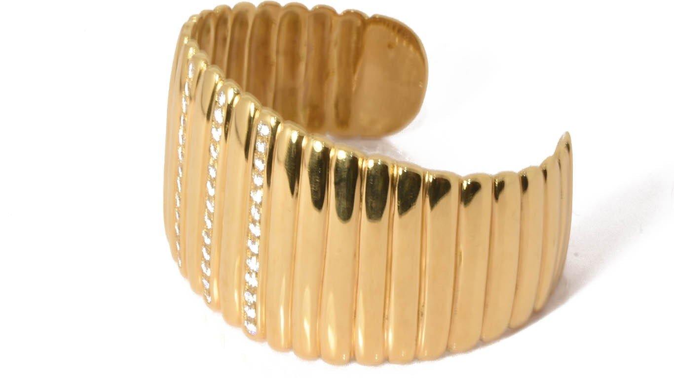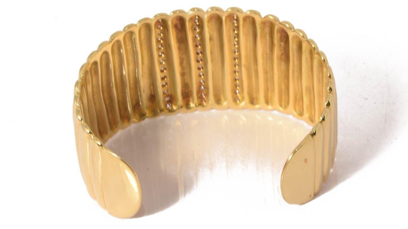 Large Manchette godronnée Or jaune 18k années 80 ornée de 3 lignes de diamants taille brillant totalisant environ:1,20cts.