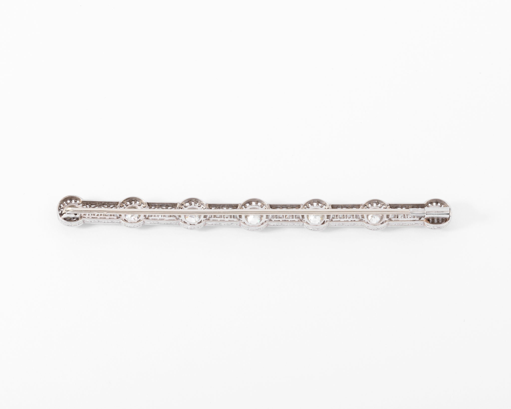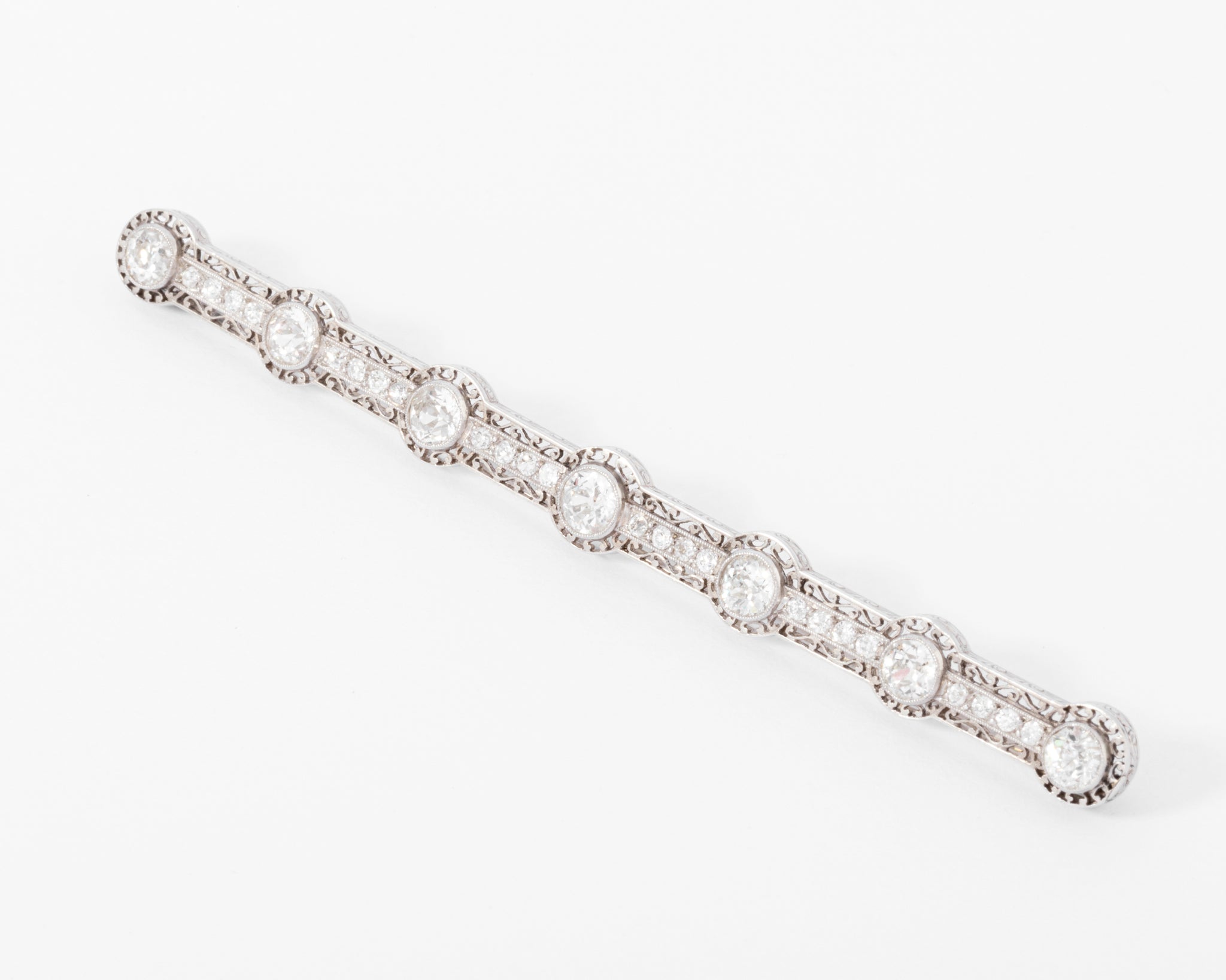 Broche barrette ornée de 7 diamant taille ancienne, composée d'une élégante monture en platine.