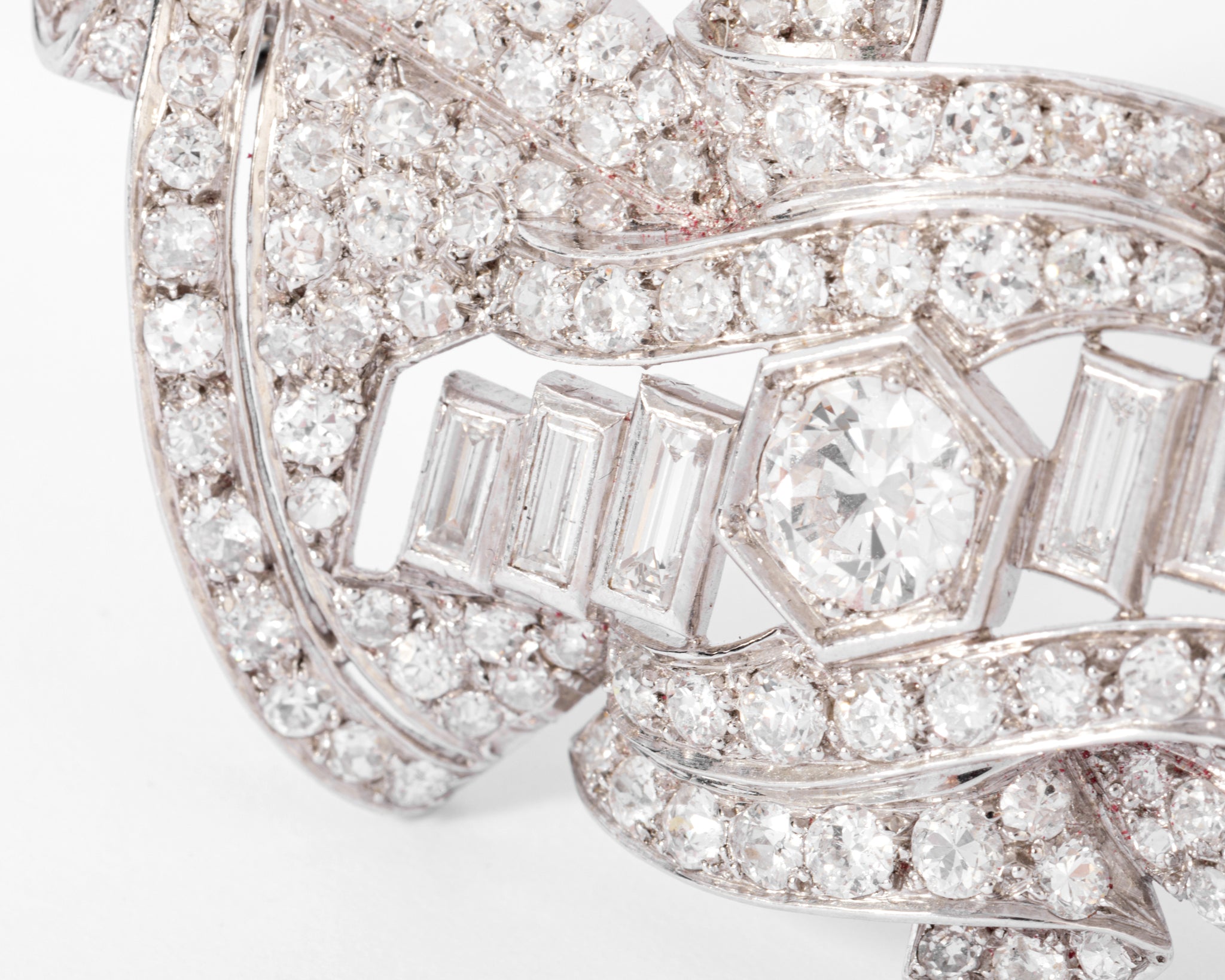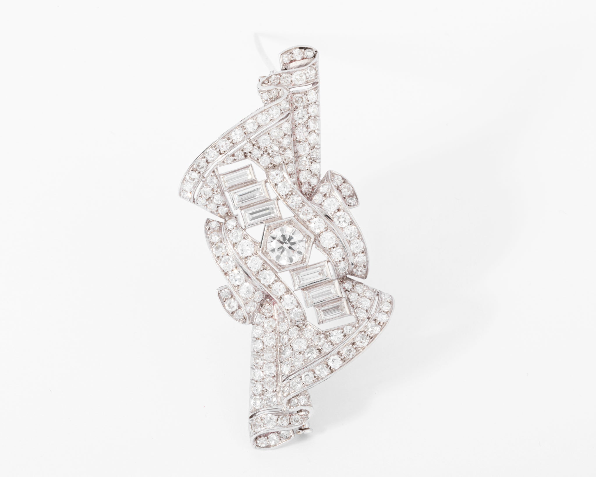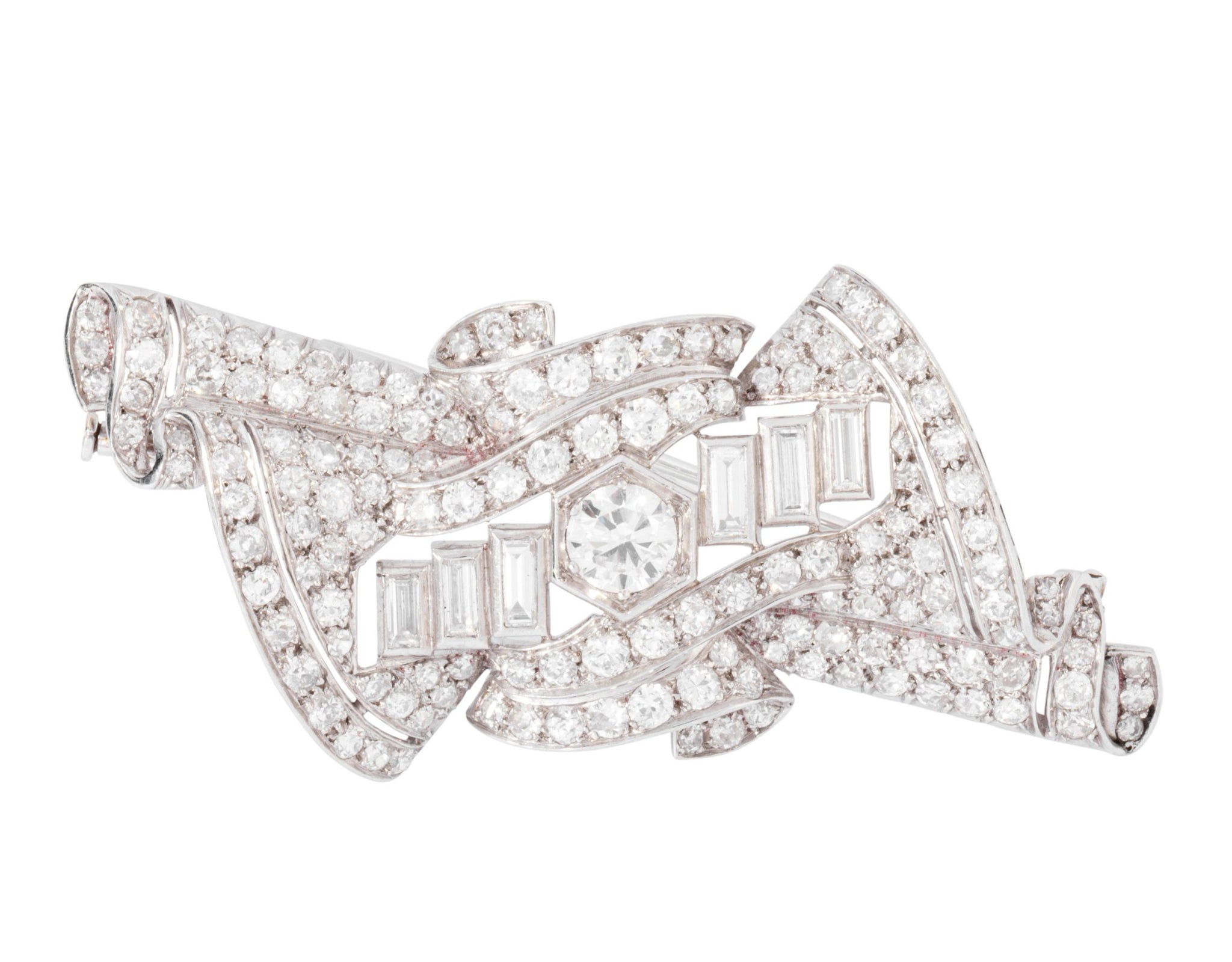 Broche en diamant des années 1930 formant une ganse ornée de diamant taille ancienne avec diamant taille baguette et diamant taille ancienne.