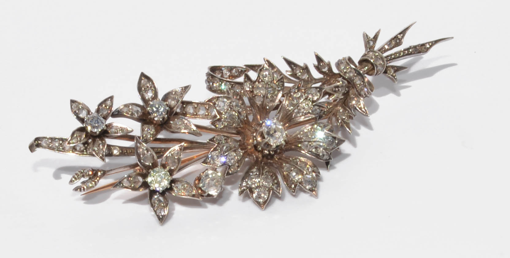 Broche fleur trembleuse en diamant taille ancienne dans son écrin qui peut aussi se porter en bijoux à cheveux.