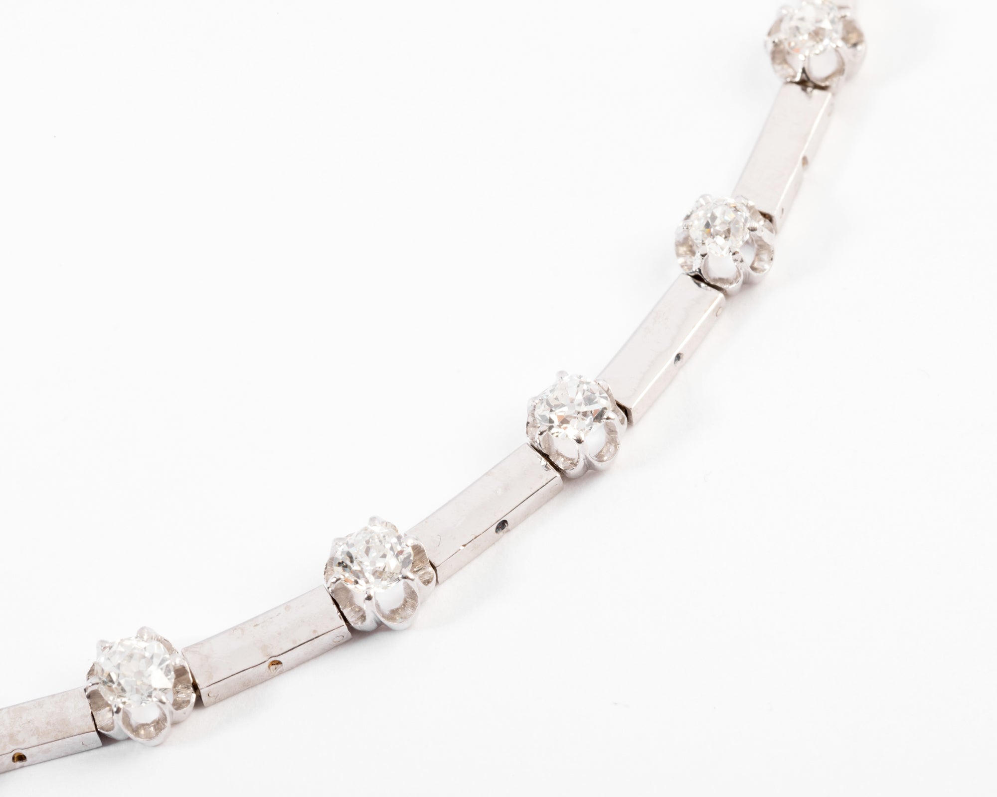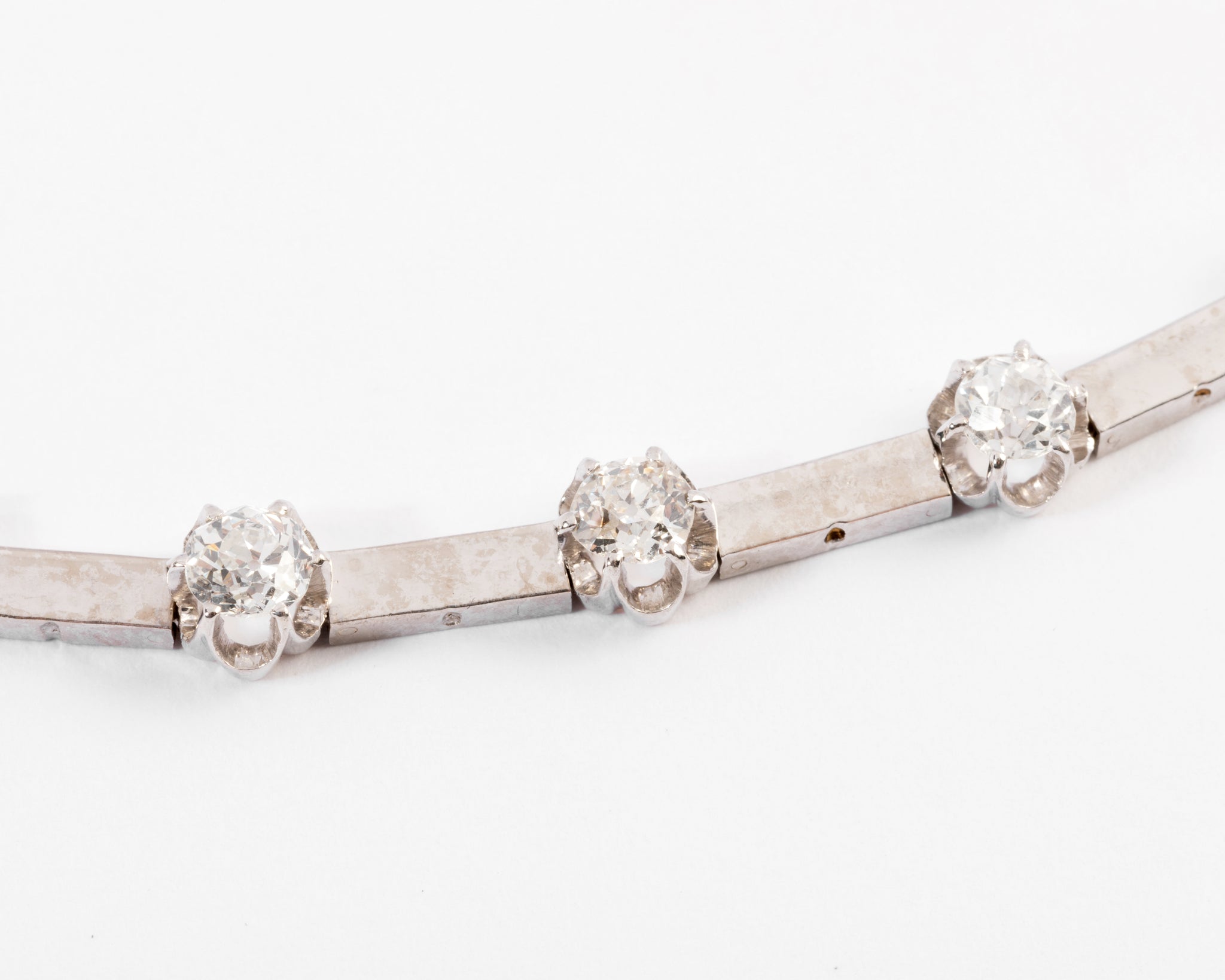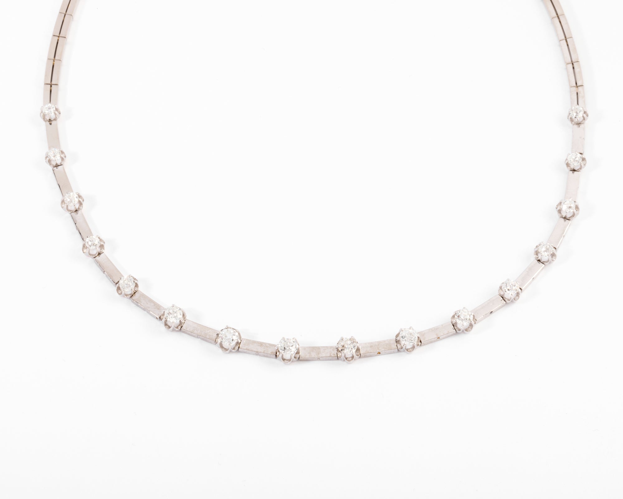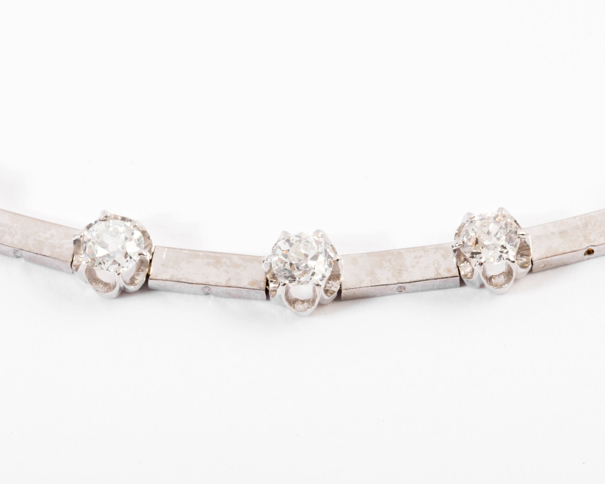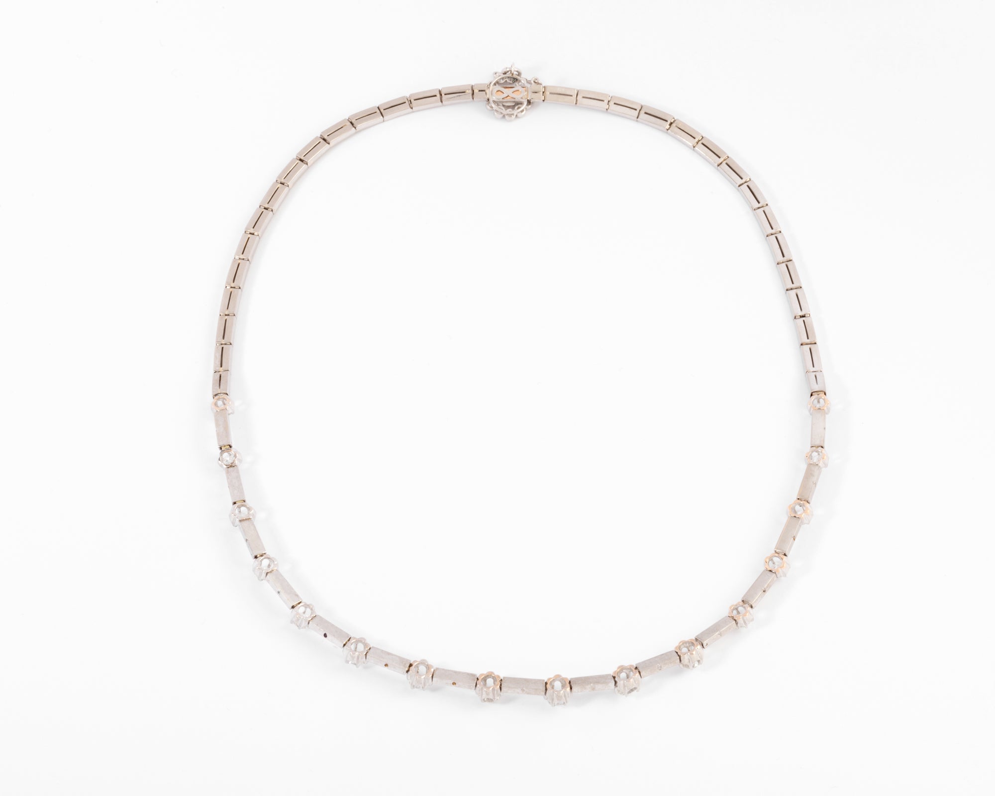 Collier en or gris datant des années 1960,intercalé de 16 diamants taille ancienne serti sur griffes d'environ 0,15ct chacun . Le fermoir est joliment agrémenté d'une marguerite en diamant dont le central fait 0,15 ct.