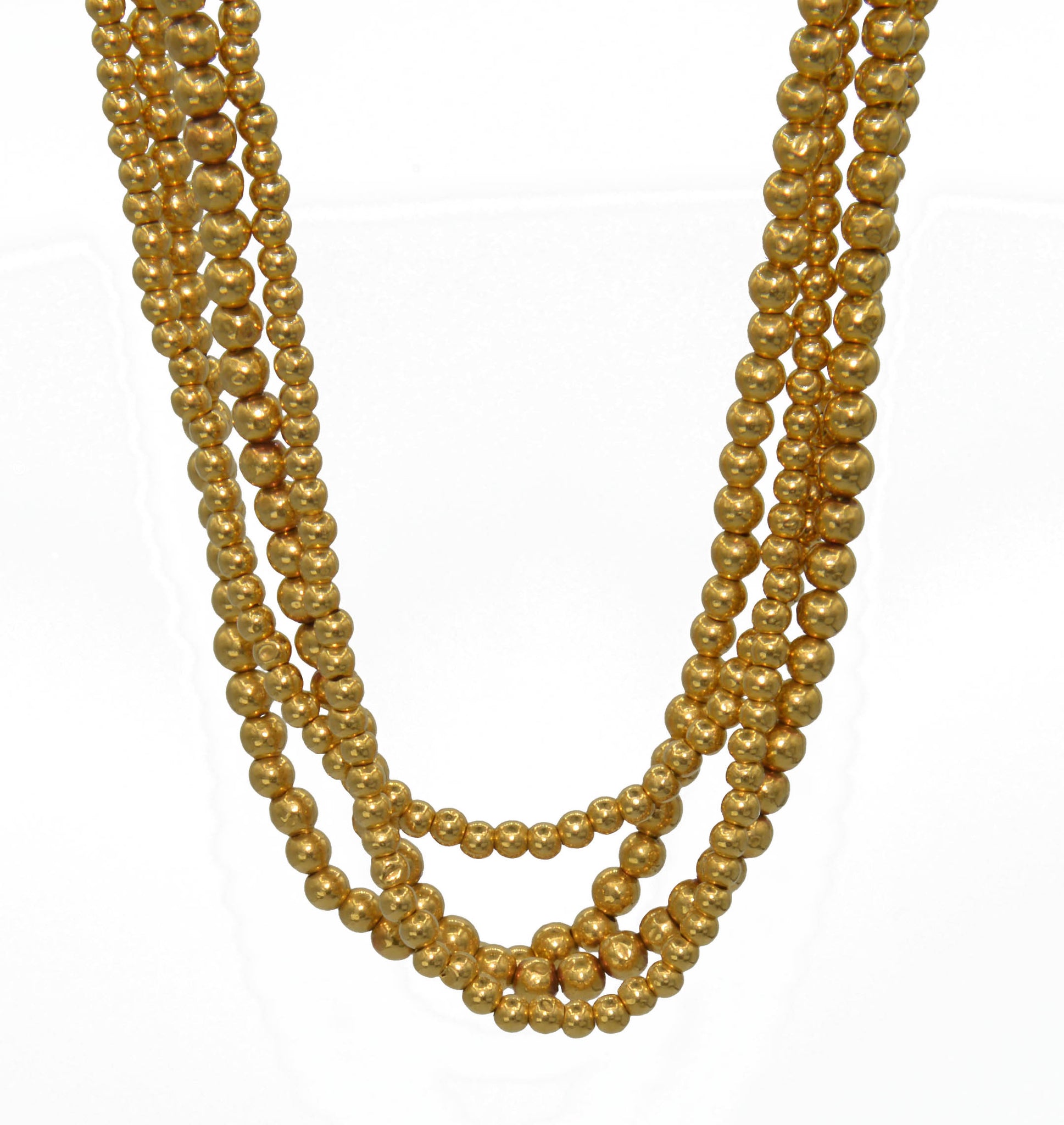 Collier Marseillais 4 rangs en or jaune. Il est composé de 4 rangs de boules d'or de taille différente: 2 rangs de 3mm de diamètre et 2 rangs en 5mm de diamètre . Le collier peut se porter en sautoir.